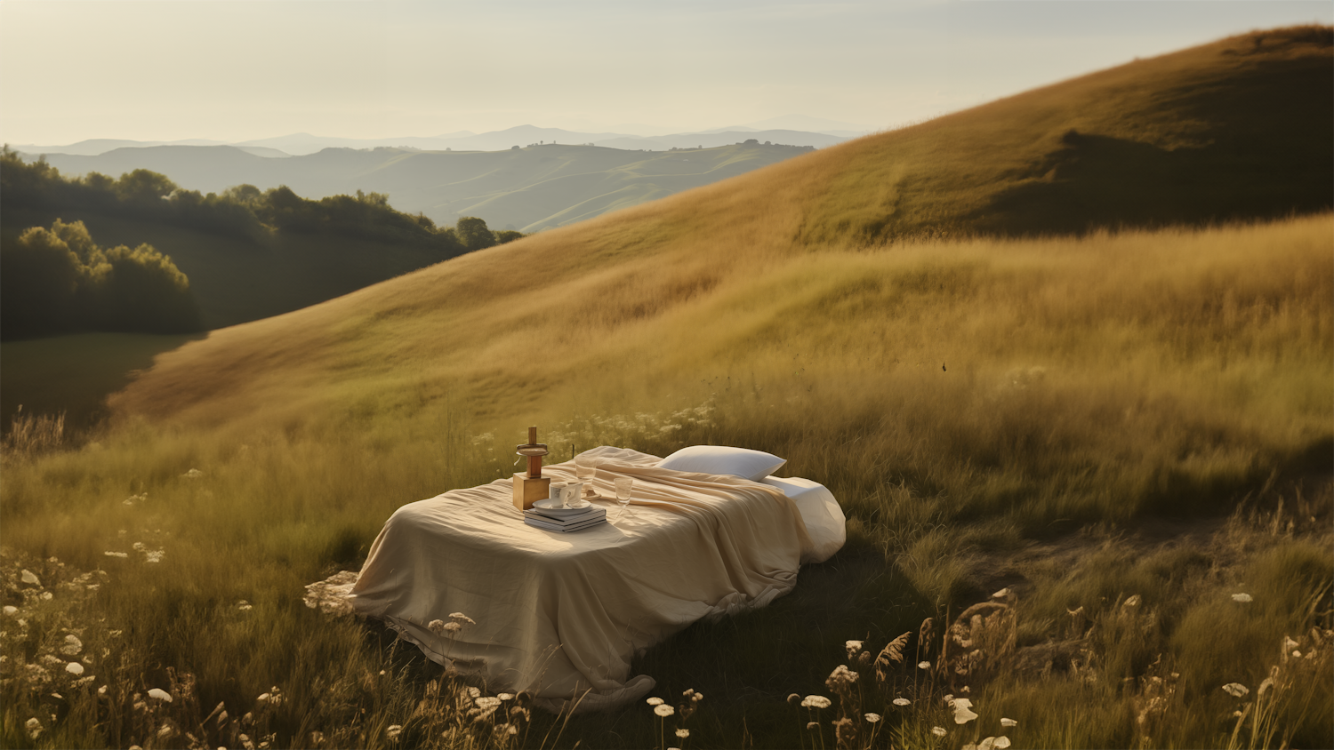 A bed with white sheets on a grassy hill under golden light, featuring a tray with a carafe and books, creating a serene outdoor retreat.