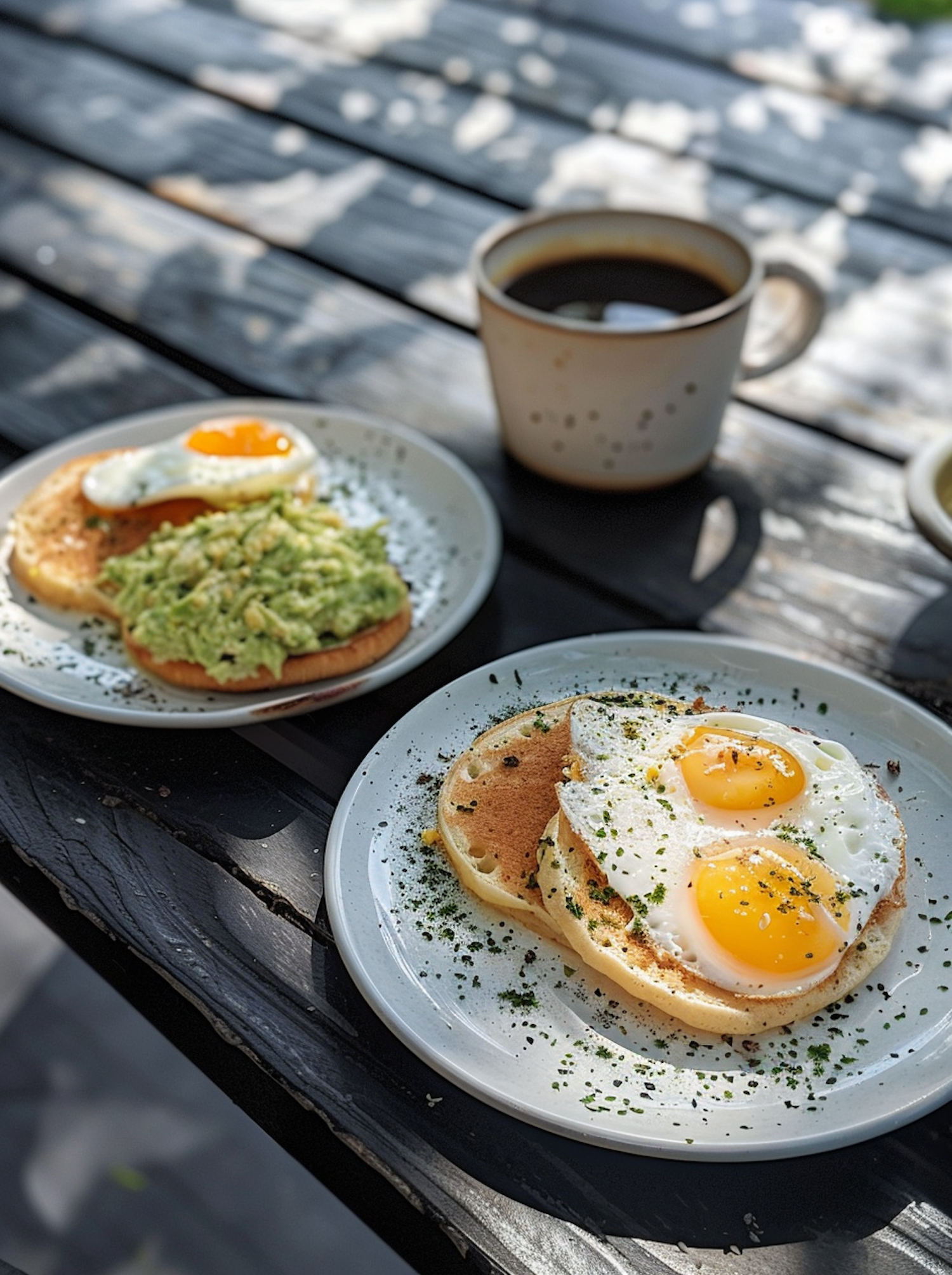 Delicious breakfast with sunny-side-up eggs, avocado toast, and coffee on a rustic table in dappled sunlight.