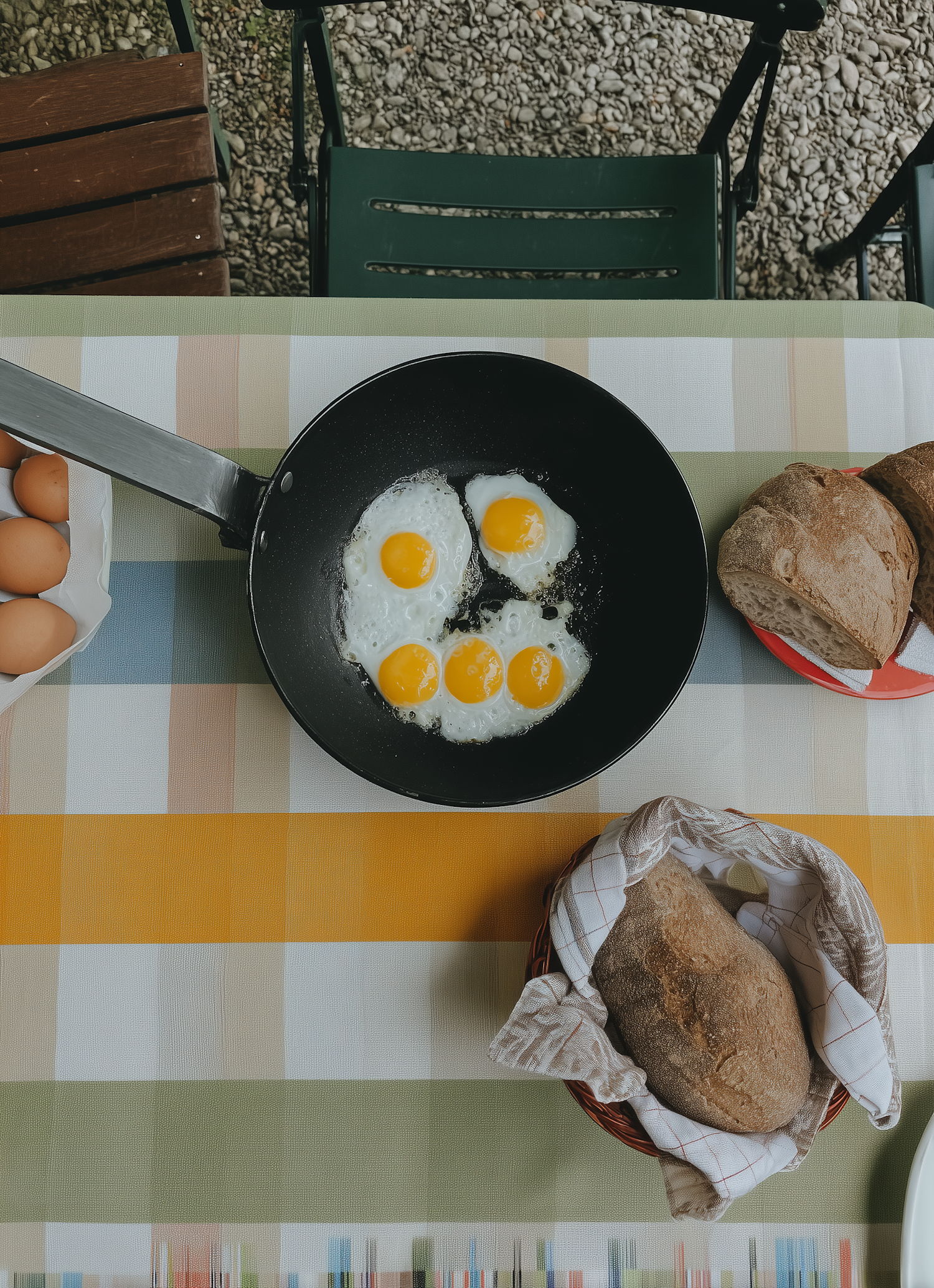 A cozy outdoor breakfast setup with fried eggs, fresh bread, and a colorful tablecloth, perfect for a relaxing morning meal.