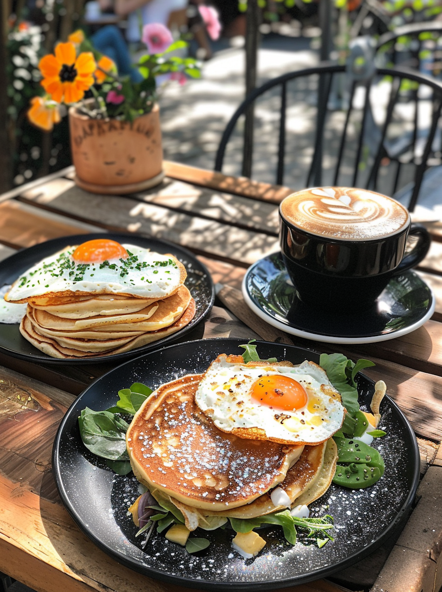 Delicious breakfast with pancakes, sunny-side-up eggs, and cappuccino in a cozy outdoor café setting.