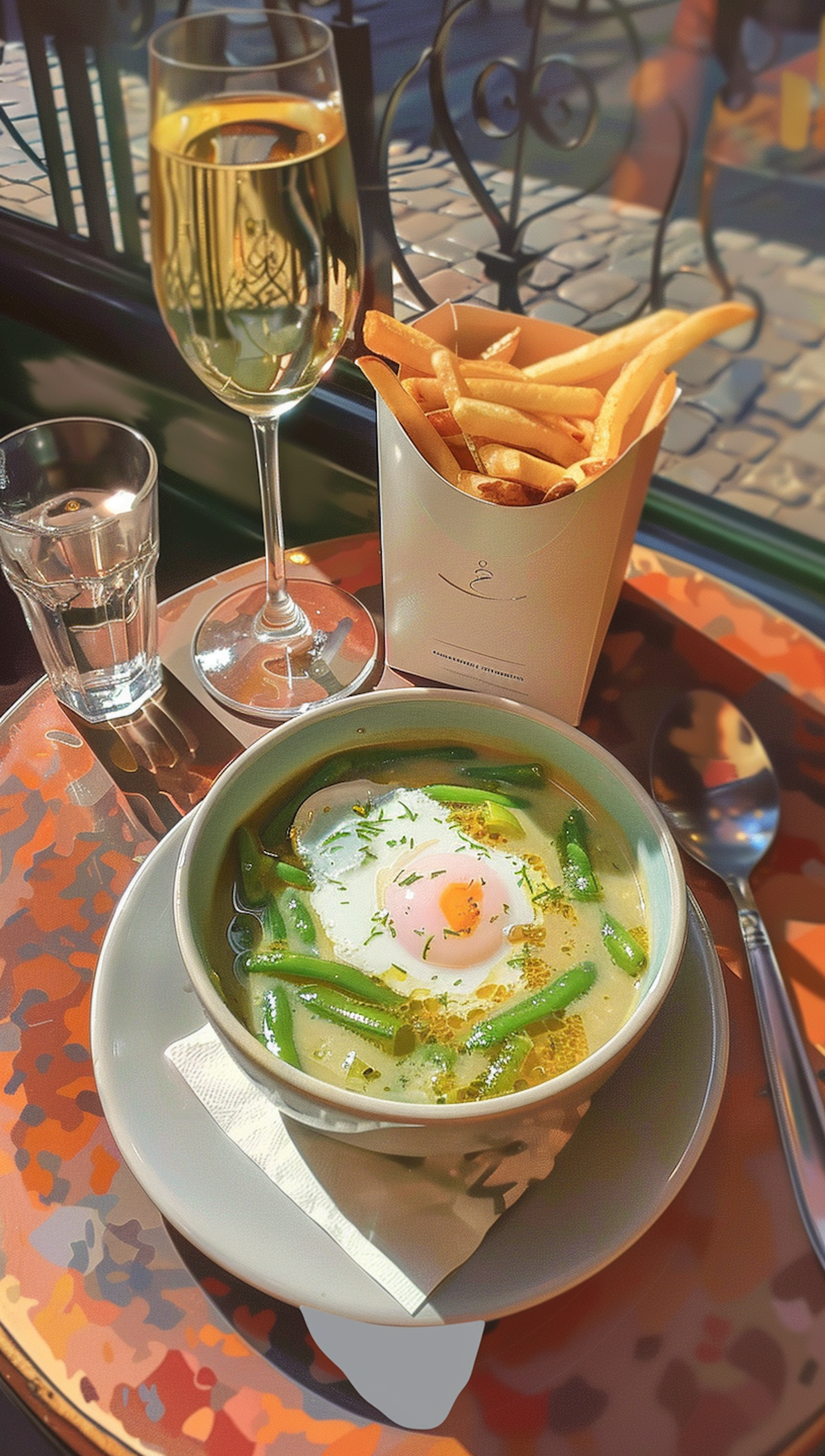Cozy café table with soup, poached egg, green beans, sparkling wine, and fries. Warm, inviting atmosphere with a touch of indulgence.