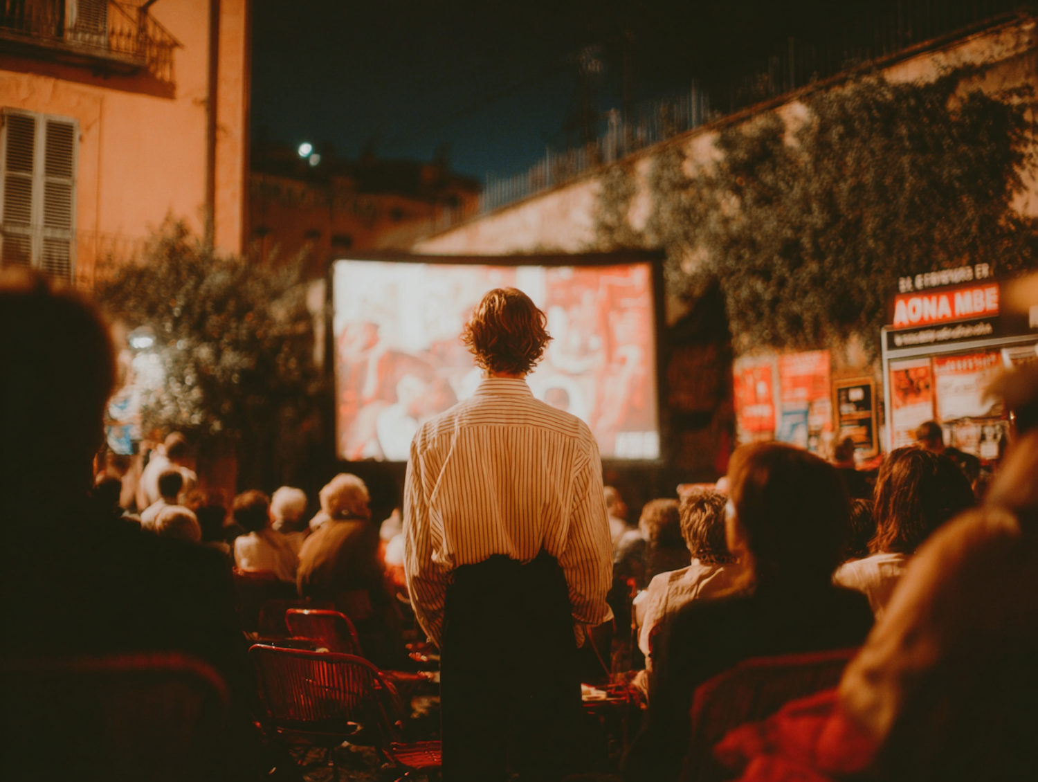 A cozy outdoor cinema at night with a crowd watching a movie on a large screen, creating a warm and inviting atmosphere.