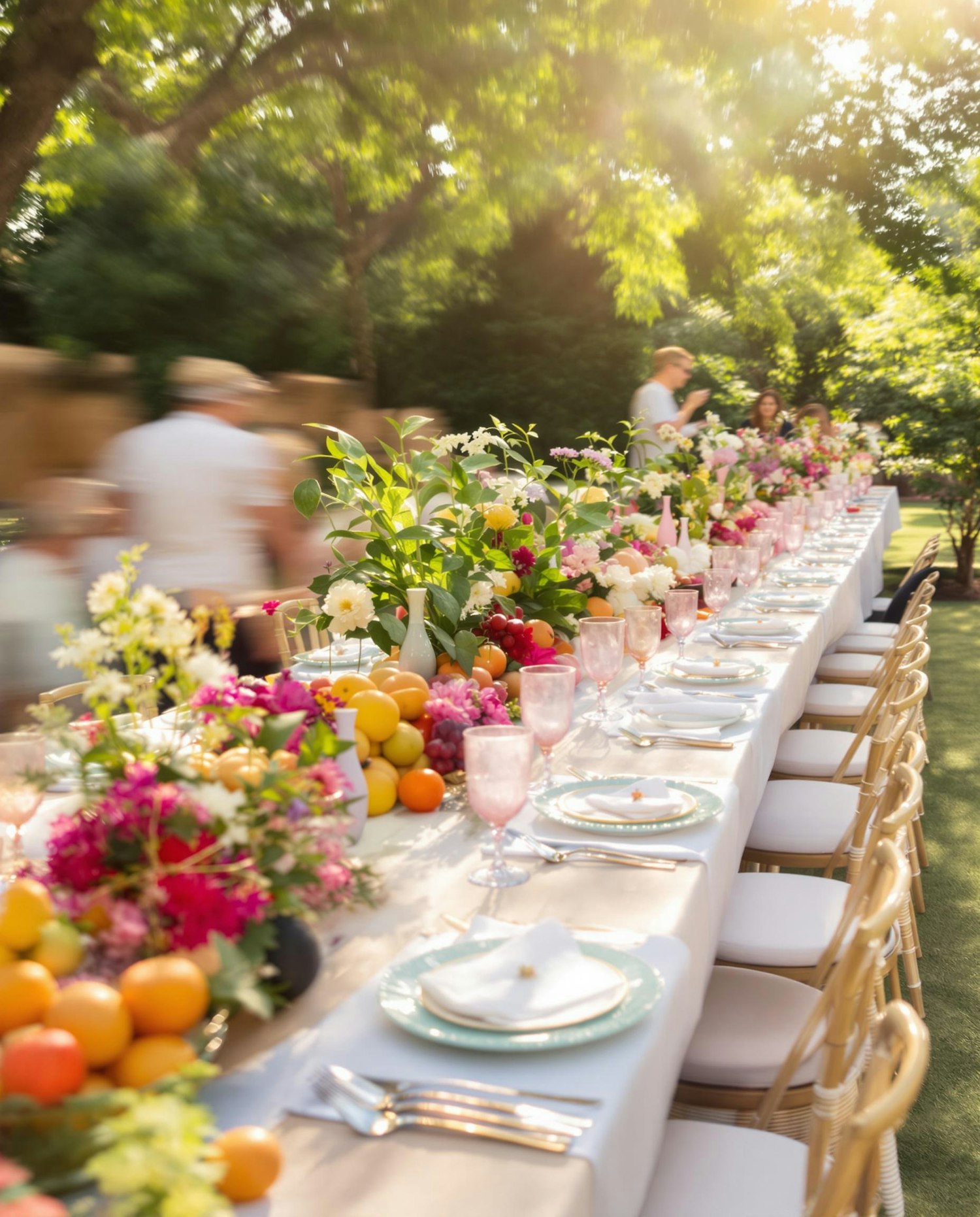 A festive outdoor dining setup with vibrant flowers, fruits, and elegant table decor, set under soft sunlight in a lush garden setting.