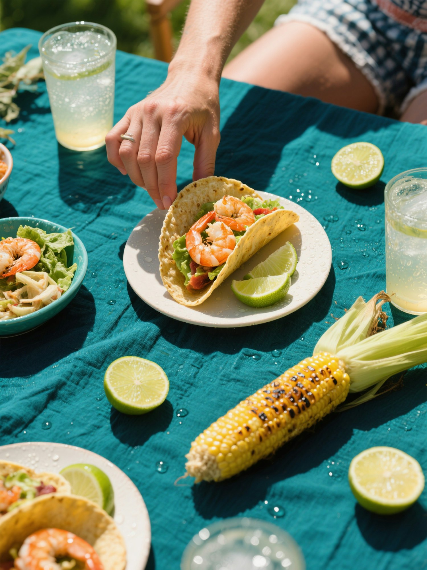 candid outdoor lifestyle photo, real moment of life, natural sunlight, hard shadows, vibrant but realistic colors, soft textures, casual summer outfit, dynamic framing, food-focused, authentic and spontaneous mood, top-down view of a table covered with a dark teal linen cloth, a hand reaching for a shrimp taco, surrounded by lime wedges, grilled corn and cold drinks, strong sun and shadows creating depth and realism