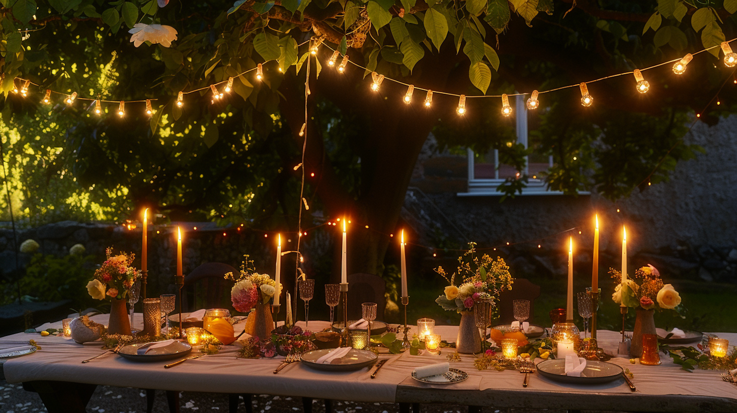 Elegant outdoor dinner setup with candles, string lights, and floral decor under a tree canopy, creating a cozy evening ambiance.