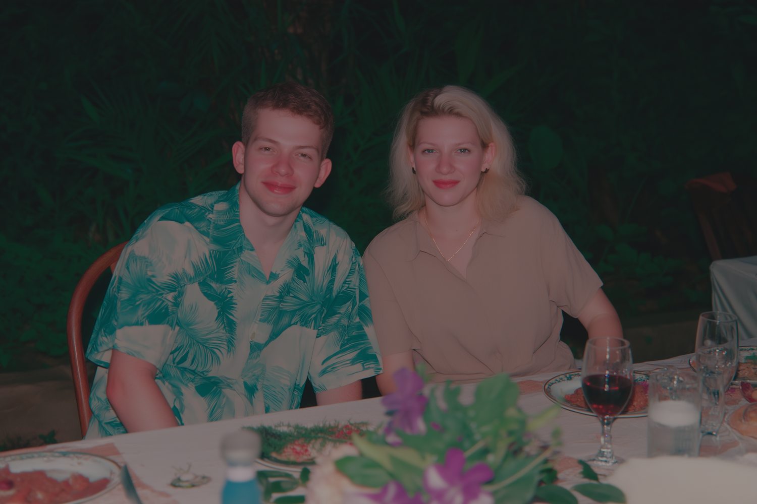 A young couple enjoying an outdoor dinner with tropical decor, surrounded by lush greenery and a cozy evening ambiance.