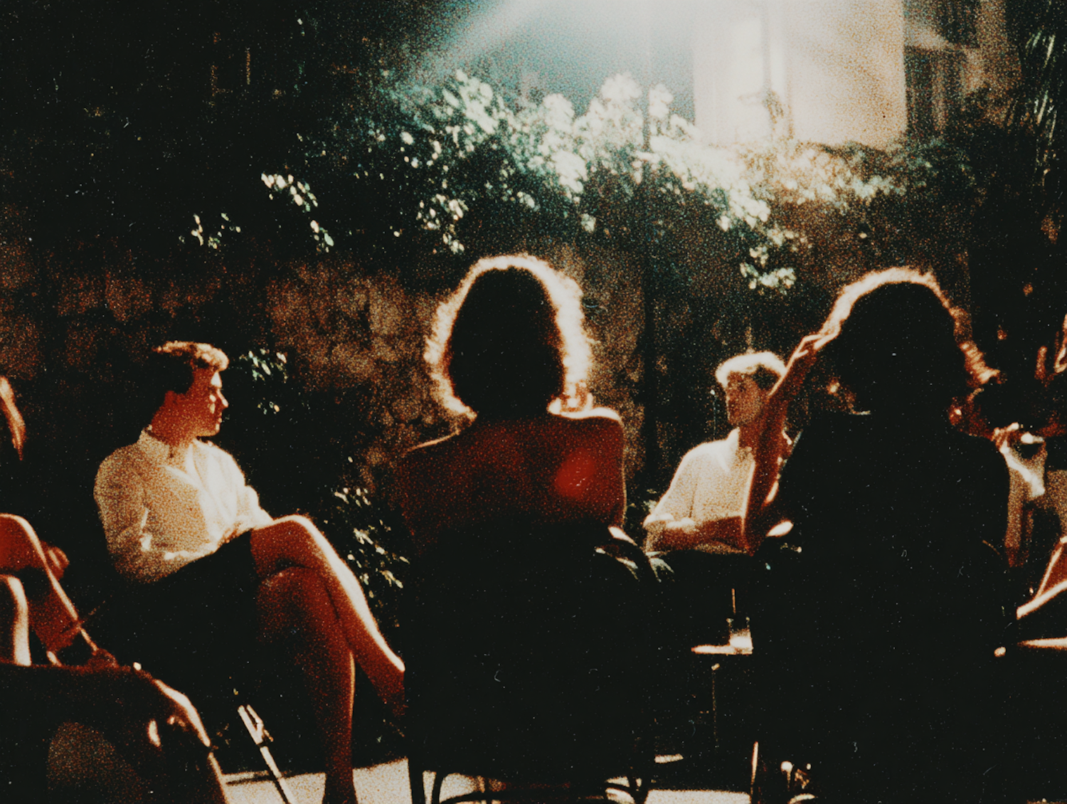 A cozy outdoor gathering with people seated under warm lighting, surrounded by foliage and a stone wall, creating an intimate atmosphere.