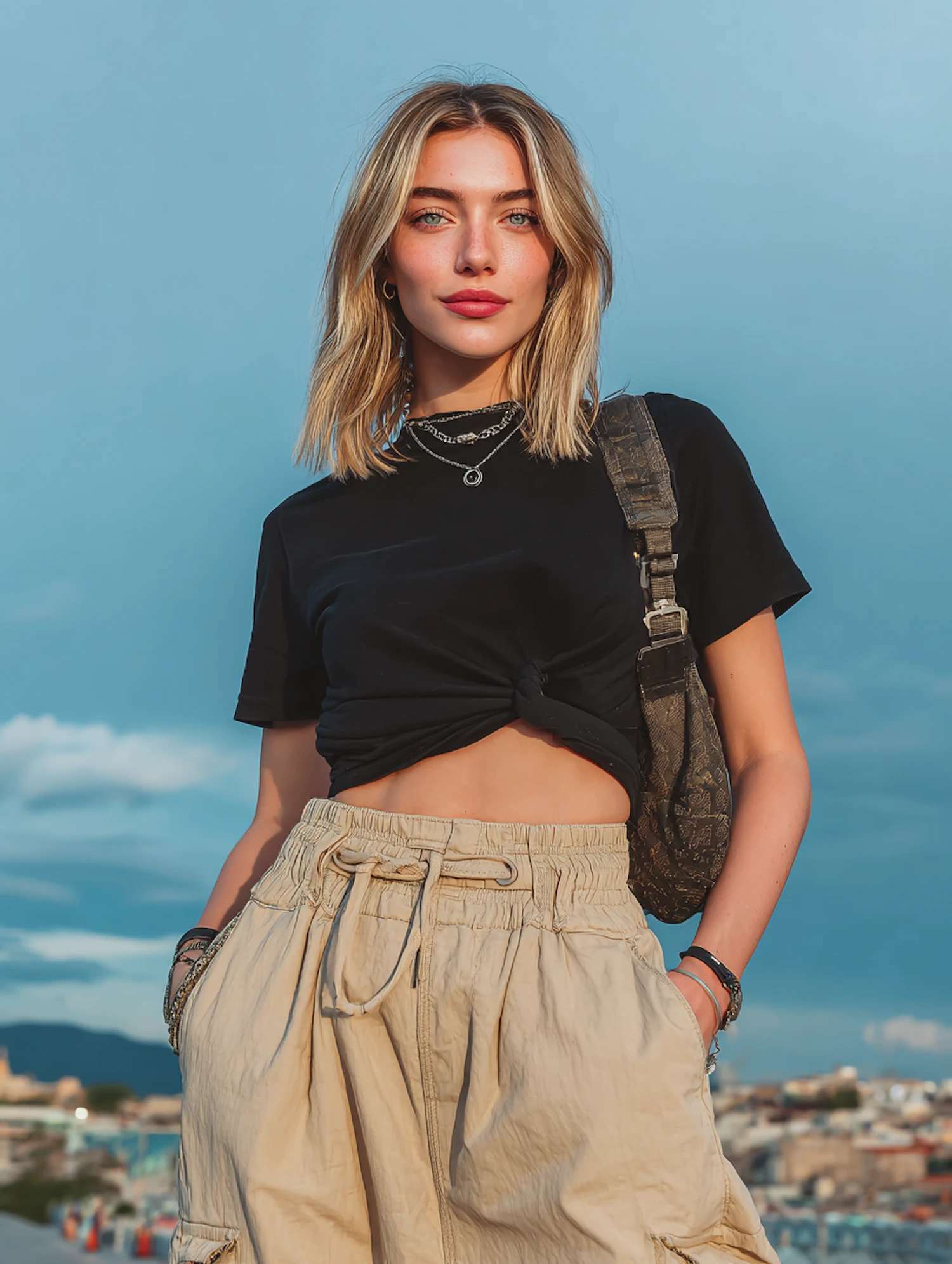 A stylish woman in a black top and beige pants poses outdoors with a cityscape and mountains in the background.