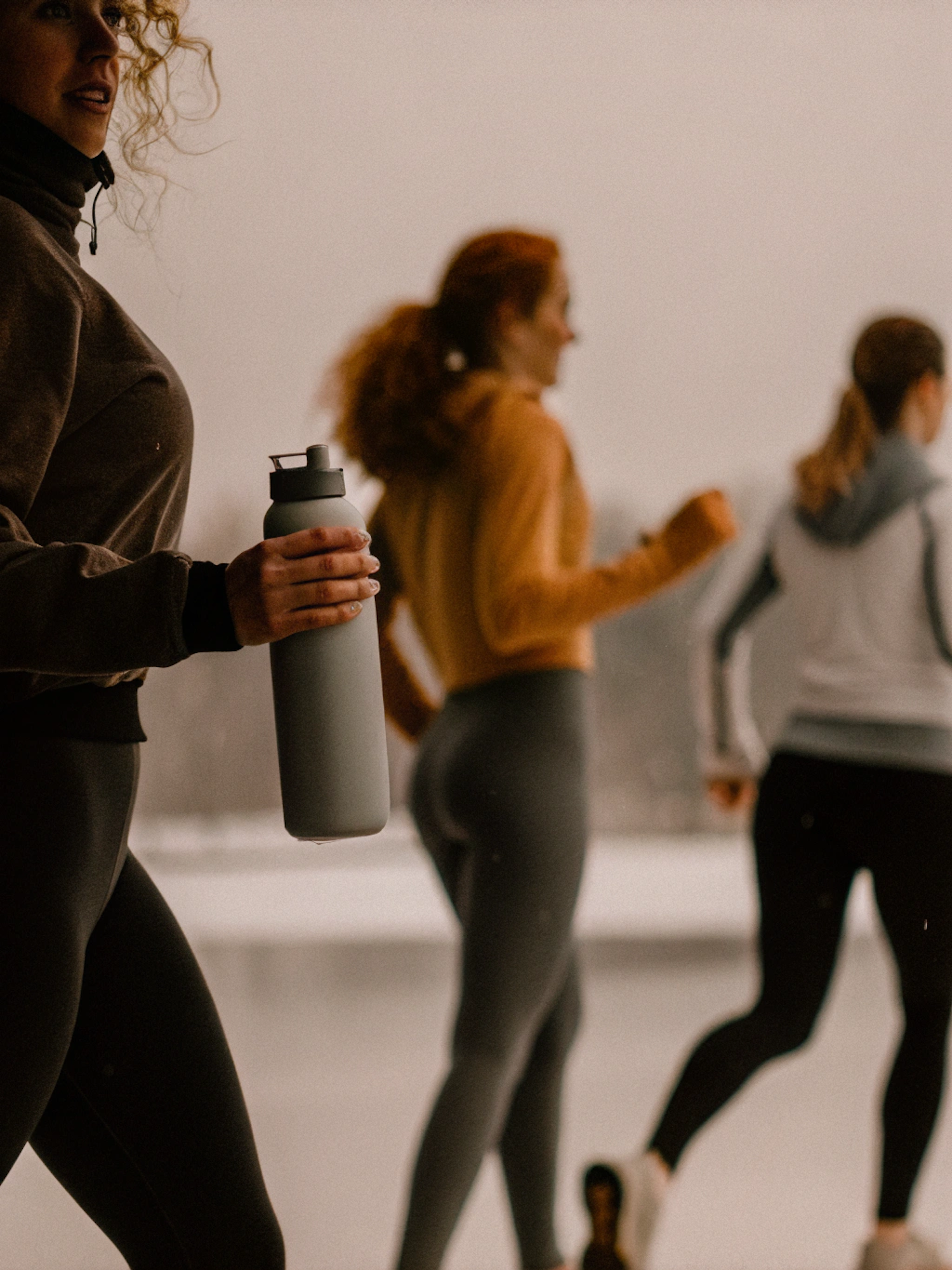Three women in activewear enjoy an outdoor workout on a snowy day, one holding a water bottle. Perfect winter fitness inspiration!
