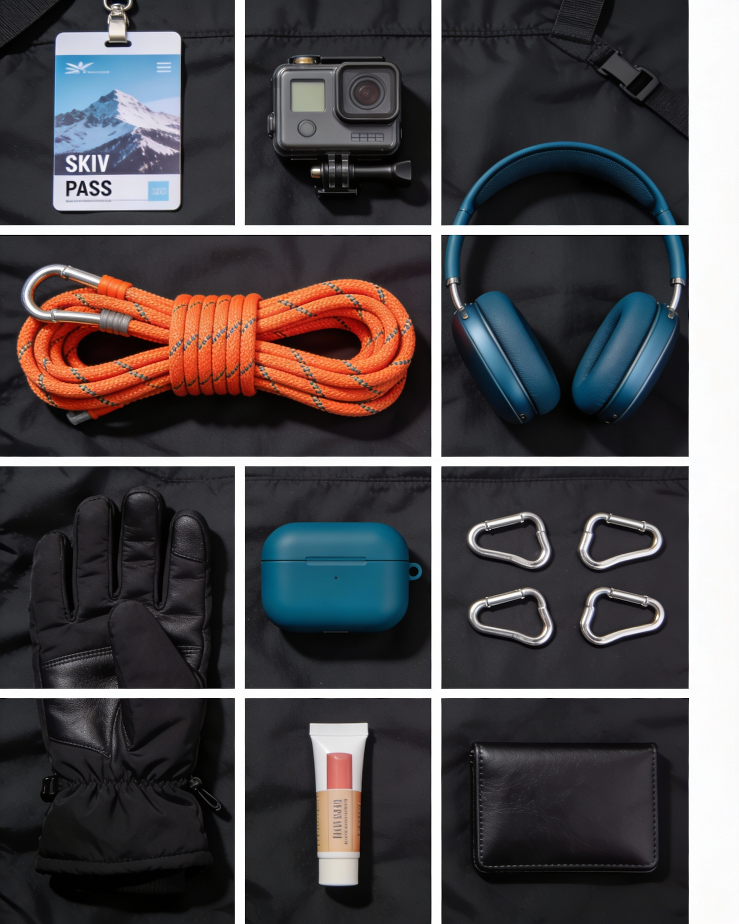 Top-down ultra-clean flat lay on a dark technical fabric background: ski pass card, compact action camera, orange climbing rope coiled neatly, cobalt-blue headphone case, black gloves, small carabiners, lip balm, minimalist wallet, arranged in a modern grid composition, sharp studio-like clarity while still outdoors, ultra-HD 4K fashion editorial photography, razor-sharp focus, extreme detail, modern luxury styling, clean composition, high dynamic range, crisp textures, premium magazine quality, contemporary fashion aesthetic, no grain, no blur, no vintage.