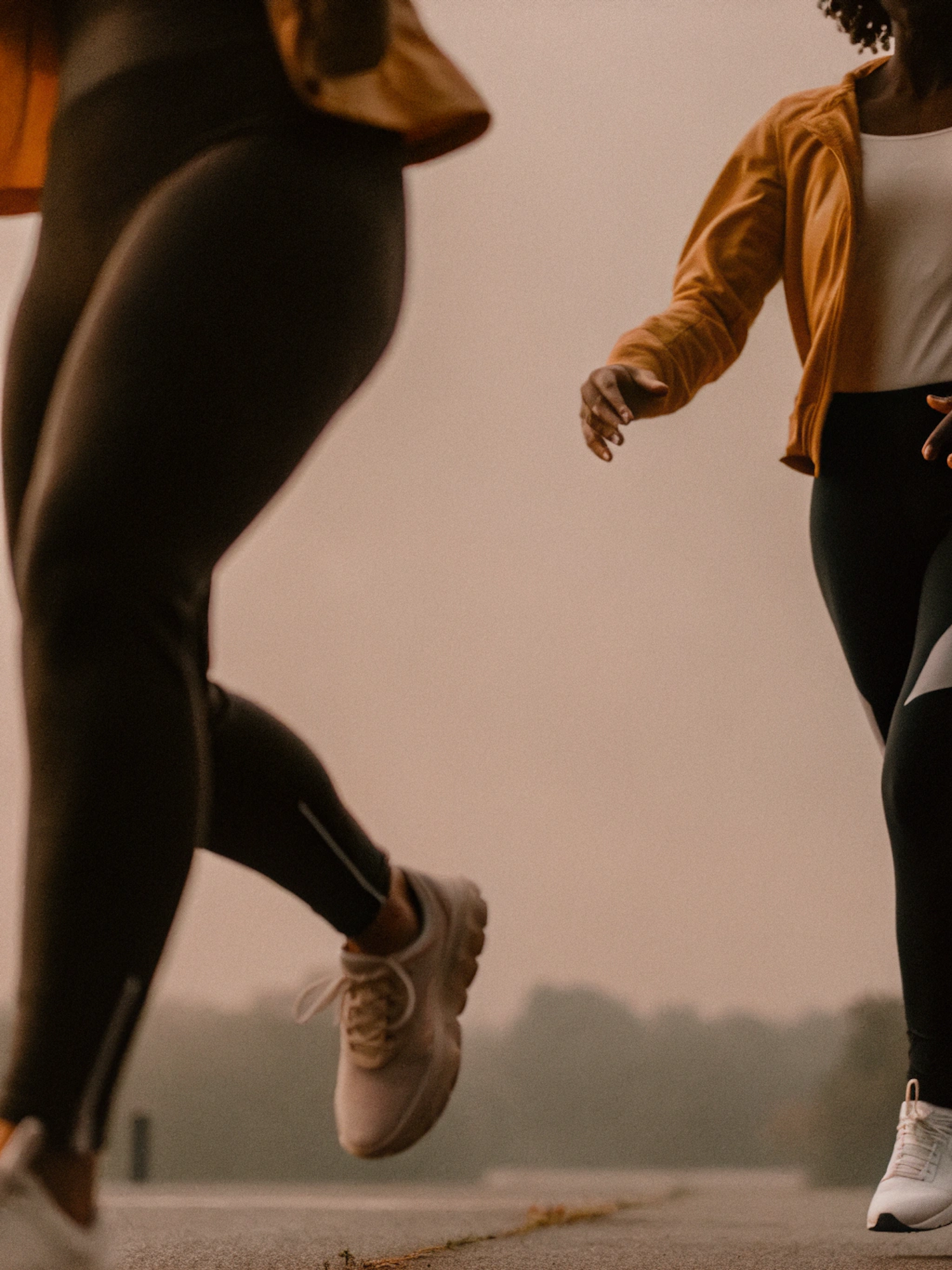 Two people jogging outdoors in athletic wear, featuring black leggings, sneakers, and a mustard-yellow jacket in a hazy setting.