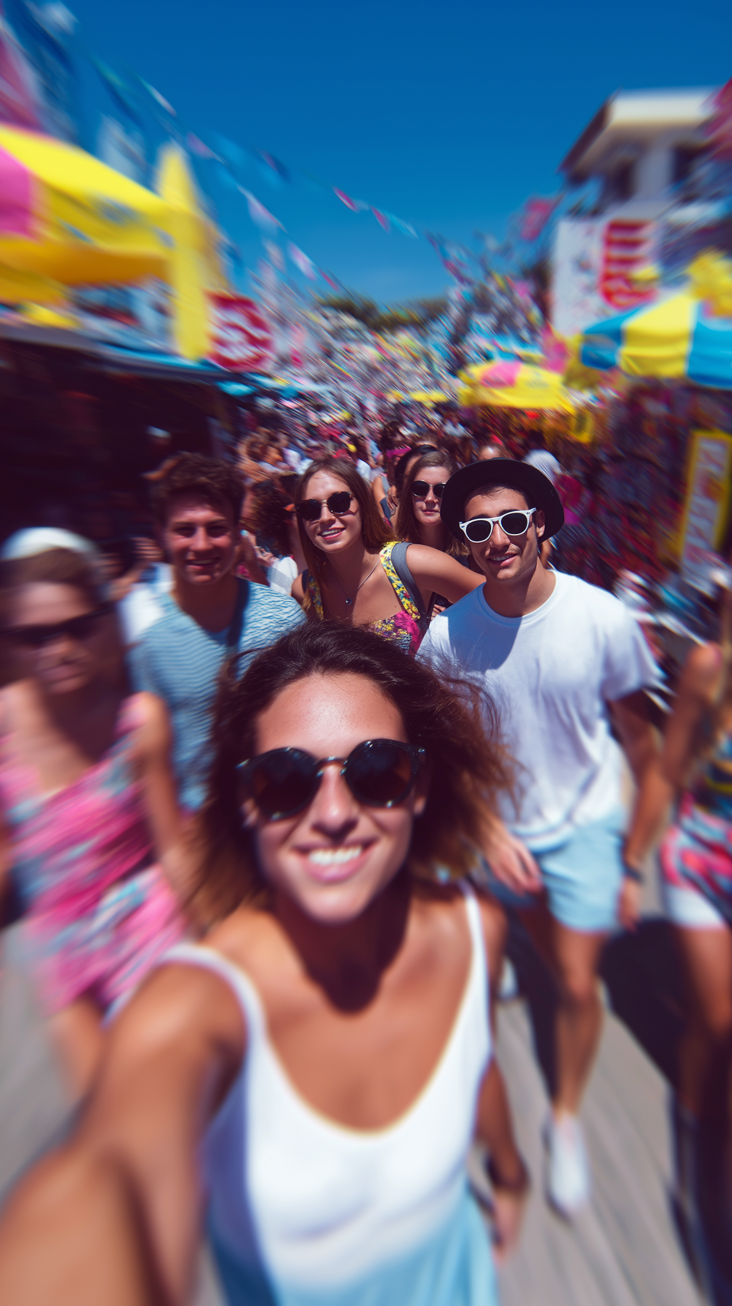 A group of friends enjoying a sunny day at a vibrant outdoor market, captured in a dynamic selfie with colorful stalls and banners in the background.