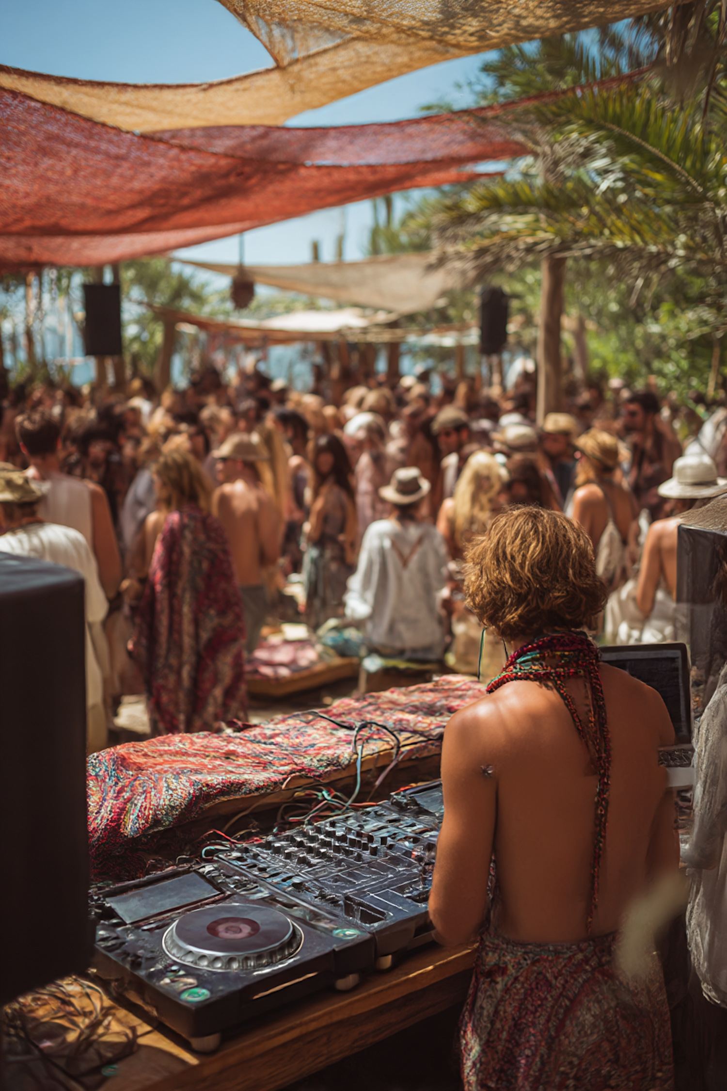 A lively outdoor music event with a DJ and a vibrant crowd under colorful fabric shades in a tropical setting.