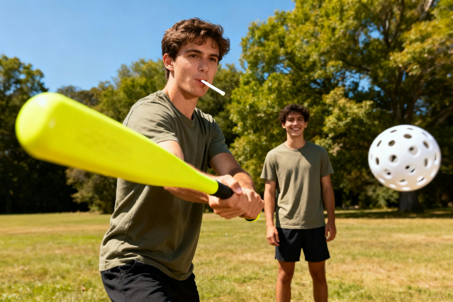An ultra-realistic photo of two young men playing wiffle ball. The man in the foreground holds a bright yellow bat mid-swing as a perforated white plastic ball approaches him. and is sucking on a lollipop. Only the stick is visible. fun, playful imagery here when we get product shots. PLAYFUL energy here.