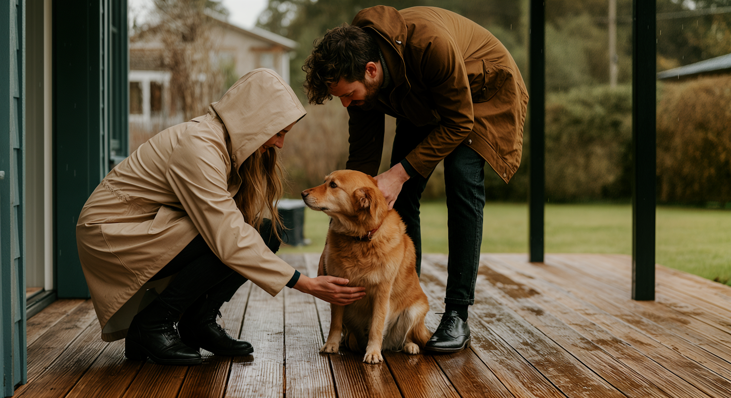 A couple in raincoats petting a golden retriever on a wooden deck during a rainy day, with a green lawn and trees in the background.