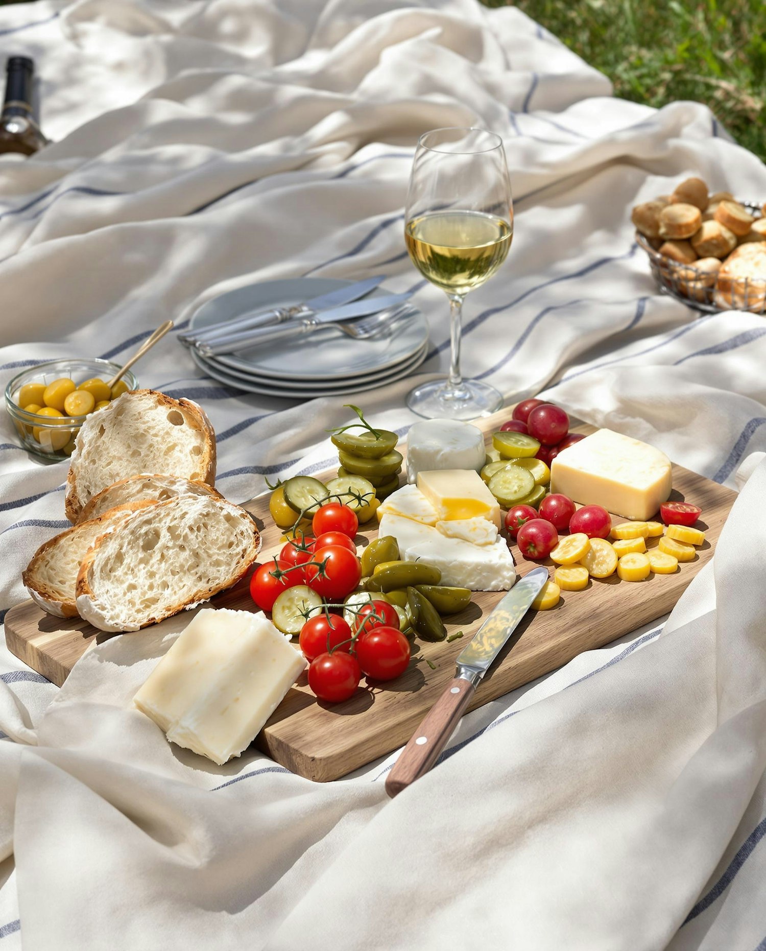 A rustic wooden cheese board on a striped picnic cloth, with sliced baguette, cherry tomatoes, pickles, and French cheeses arranged carefully. A glass of white wine stands nearby. Bright natural light, textures of linen and wood visible, relaxed gourmet atmosphere.