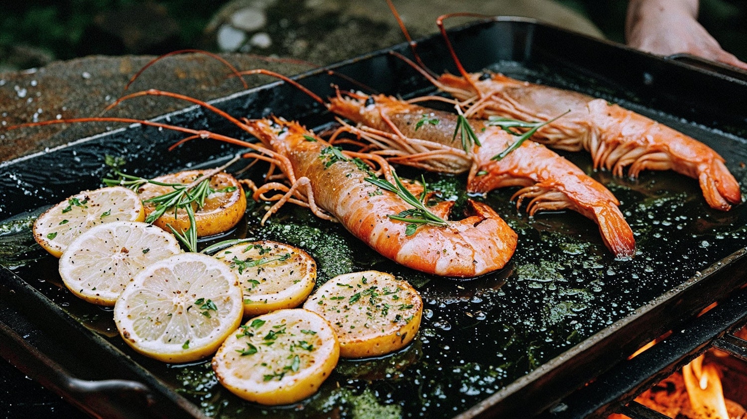 Grilled prawns with rosemary and lemon slices on a sizzling grill, garnished with herbs and pepper, set in an outdoor cooking scene.