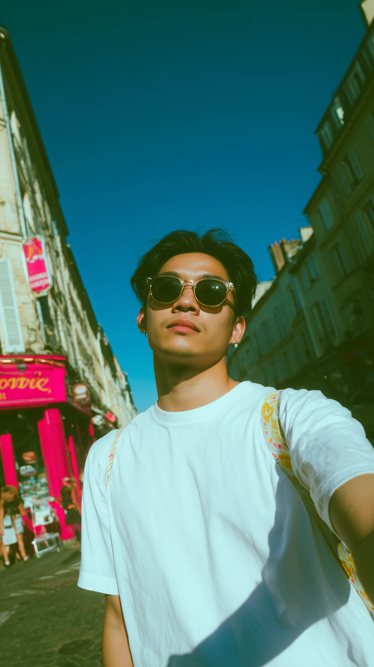 Stylish young man in sunglasses takes a selfie on a sunny day, with a vibrant street and blue sky in the background.