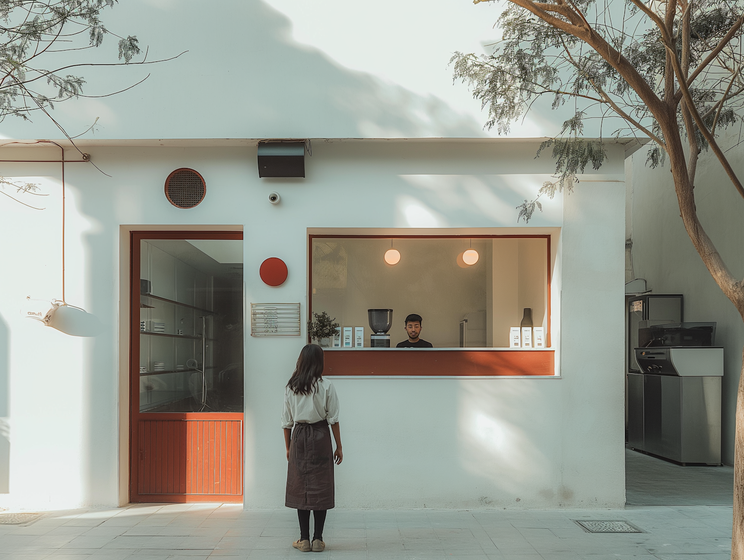 Minimalist coffee shop scene with Asian woman in apron waiting at window, soft natural light, and serene atmosphere.