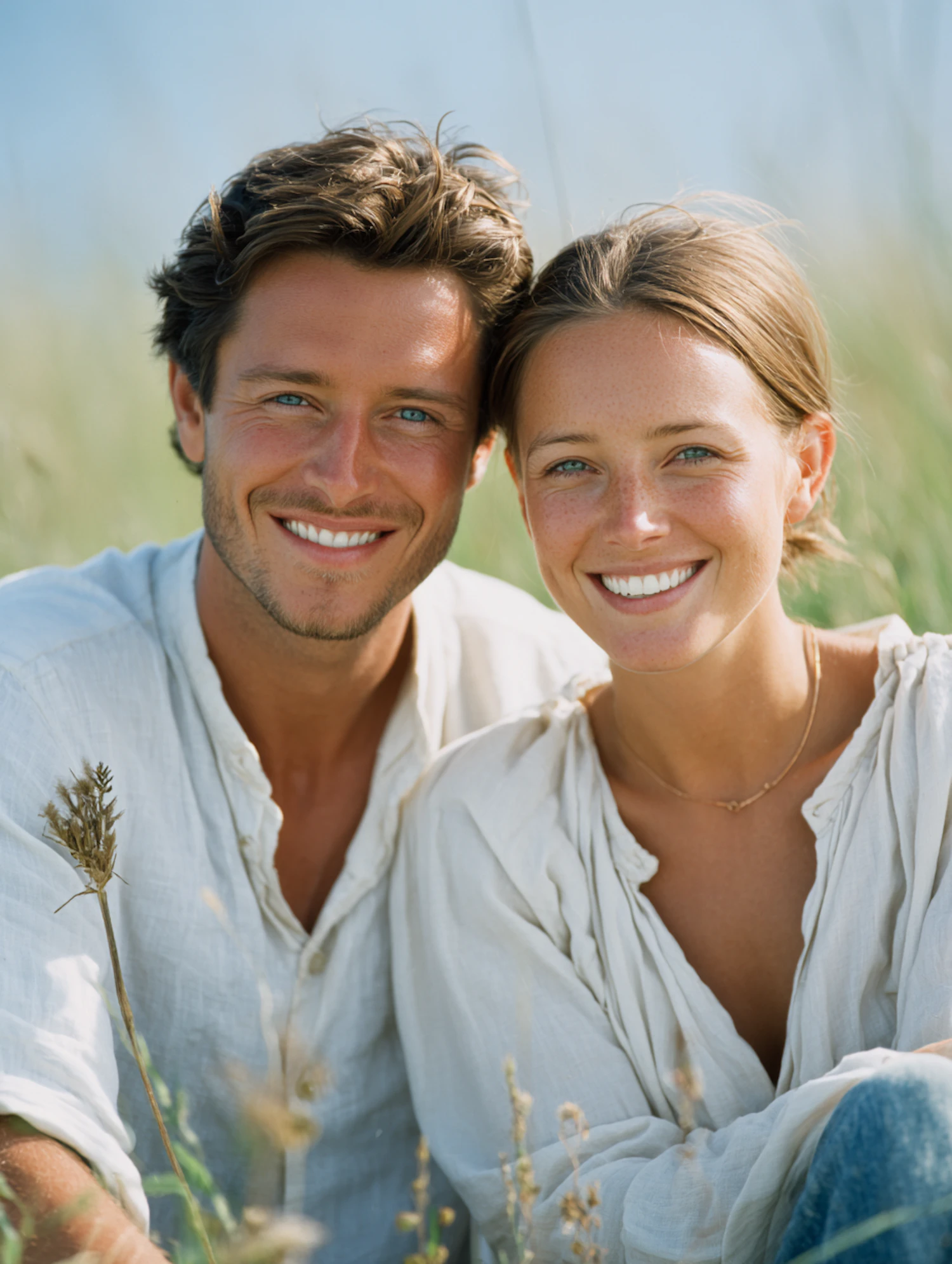 A smiling couple enjoying a sunny day outdoors, surrounded by tall grass and a clear blue sky, dressed in casual light-colored clothing.