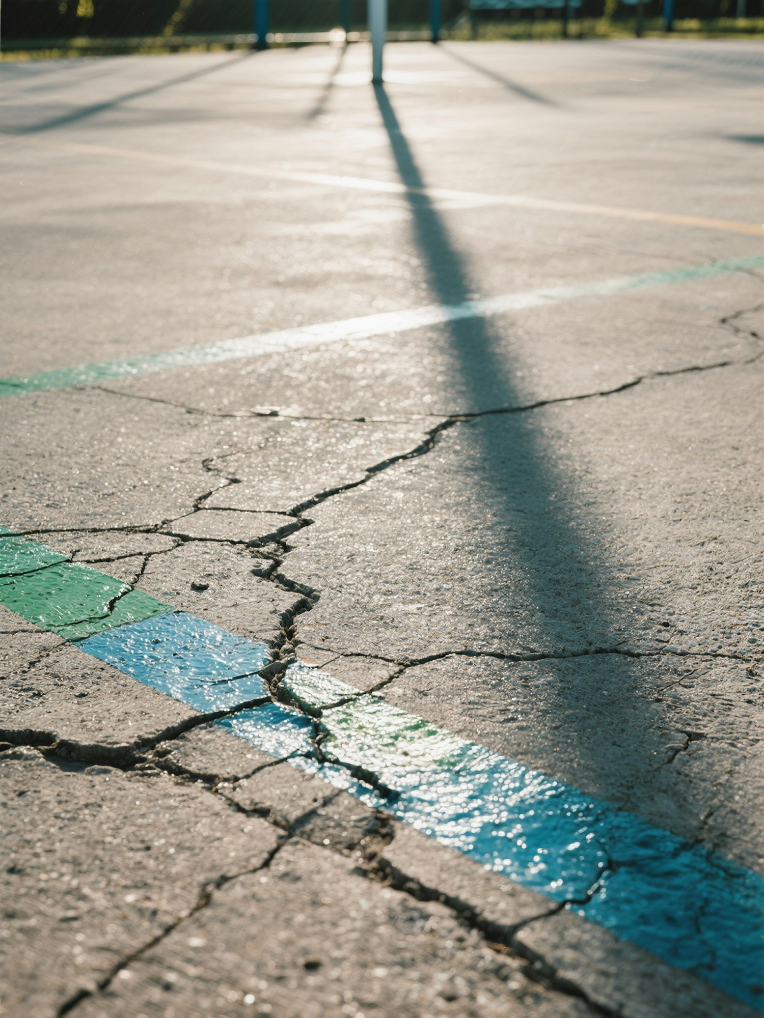 Cracked concrete with blue and green lines under sunlight, likely an outdoor sports court, showcasing texture and vibrant colors.