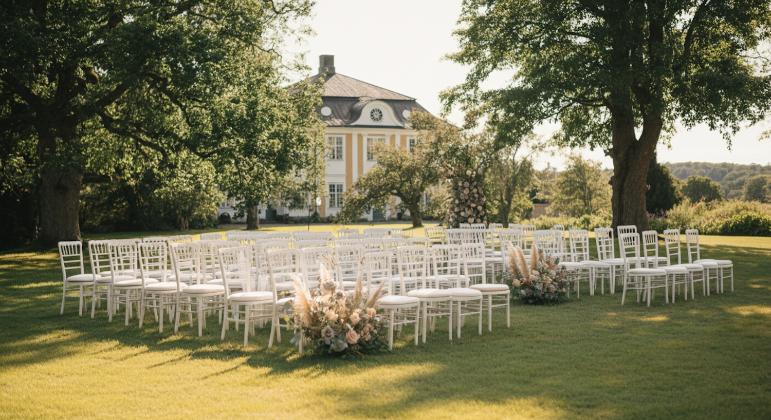 Elegant outdoor wedding setup with white chairs, floral arrangements, and a grand building in the background under sunny skies.