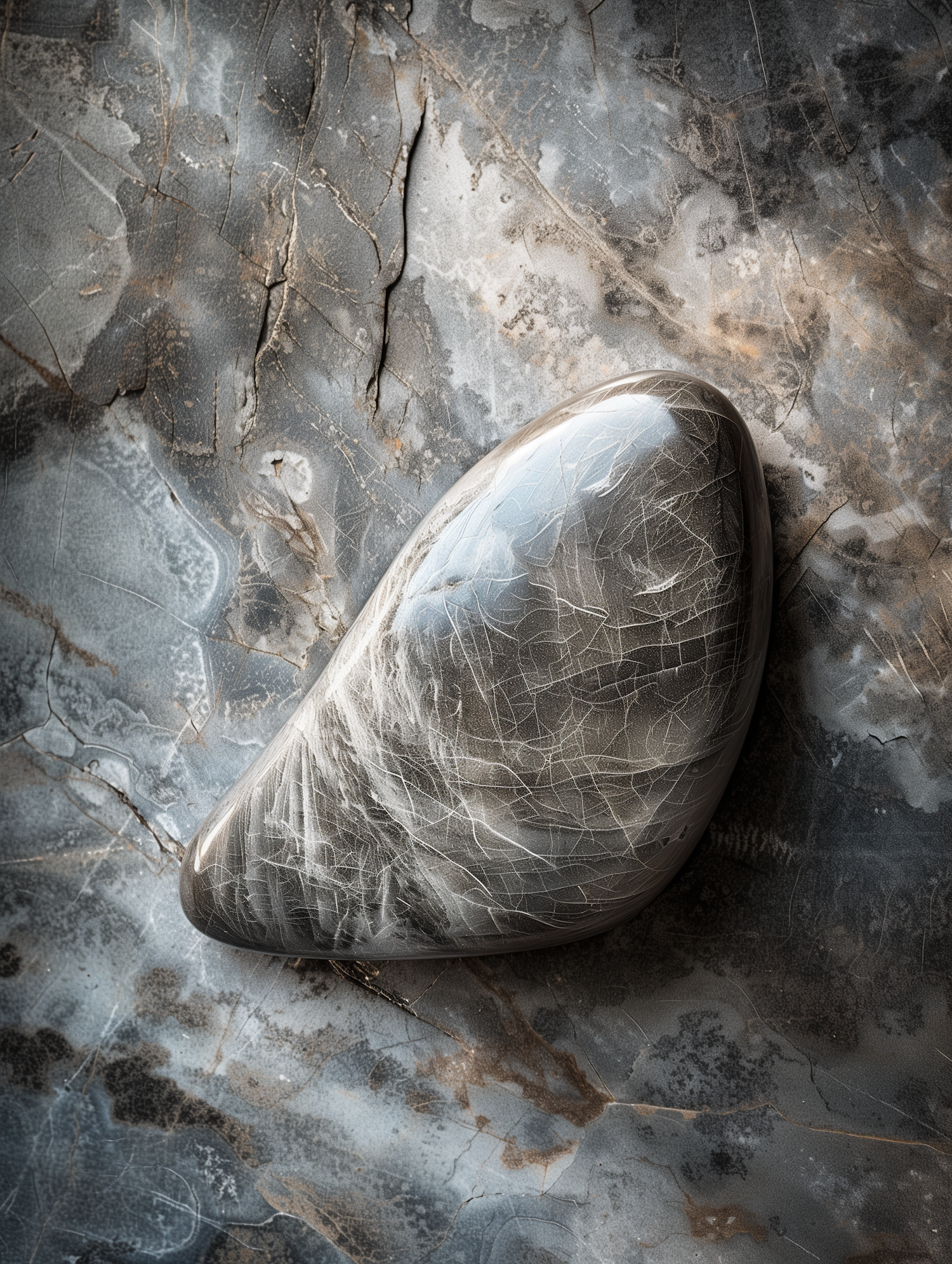 Smooth, polished stone with intricate veining on a marbled surface, showcasing natural textures and earthy tones.
