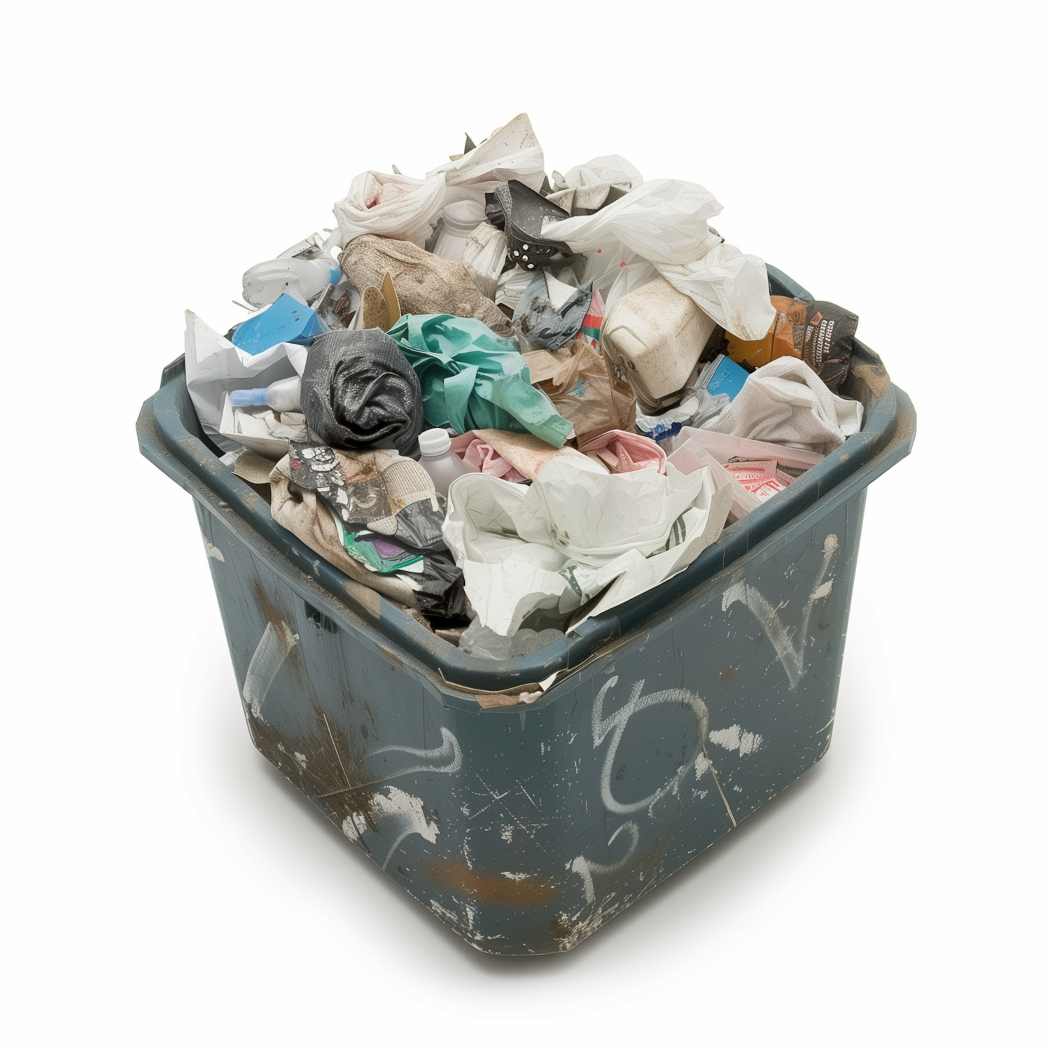 Overflowing trash bin filled with plastic bags, paper, and waste, set against a white background. Perfect for waste management visuals.