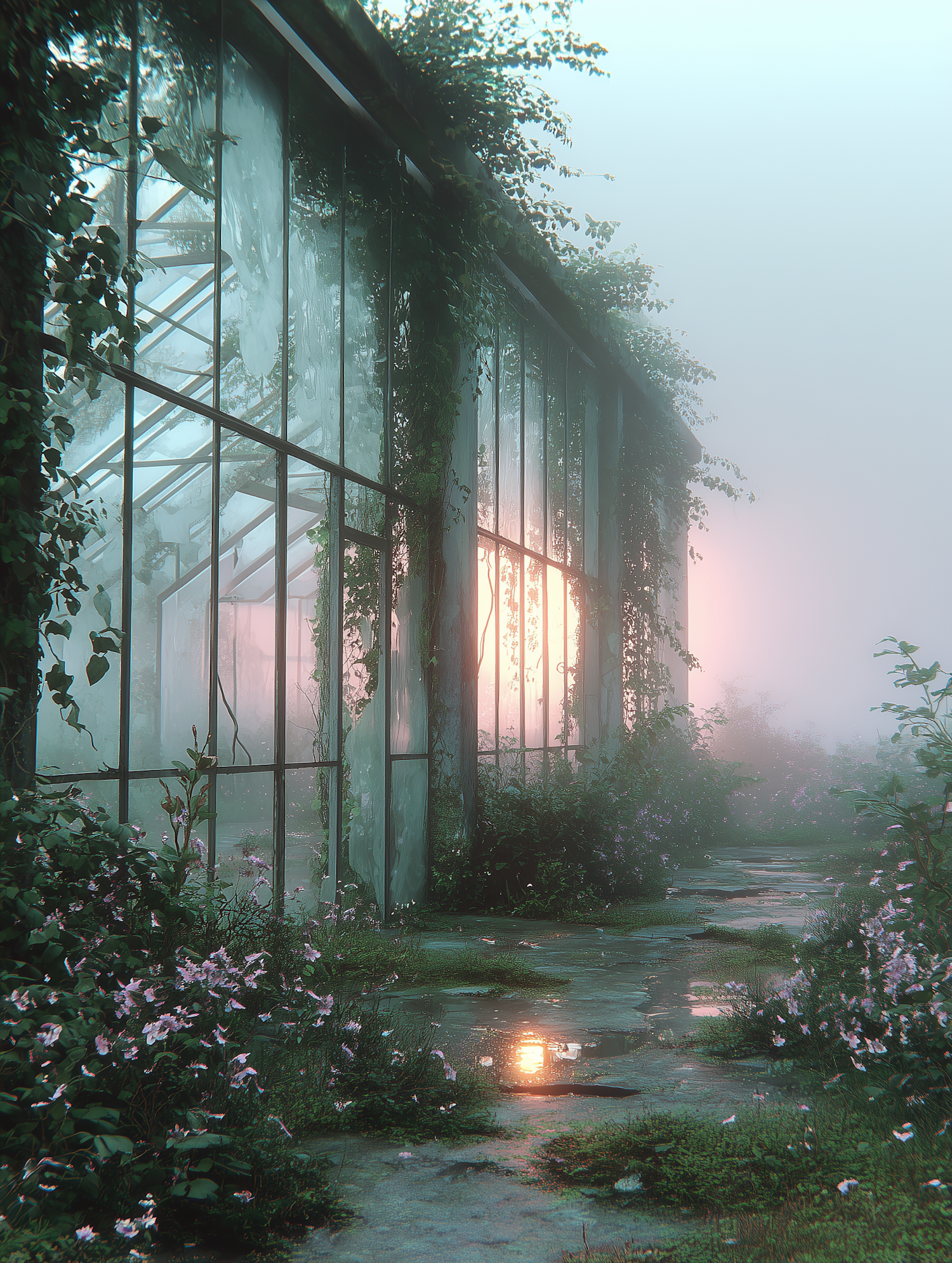 A misty sunrise illuminates an overgrown greenhouse, with lush plants and flowers surrounding the reflective glass panels.