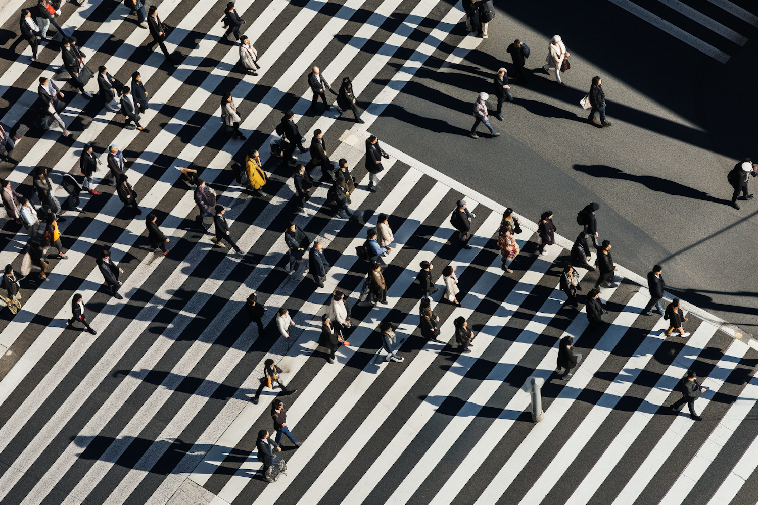 Overhead view of a busy crosswalk with pedestrians casting long shadows on black-and-white stripes, creating a dynamic urban scene.