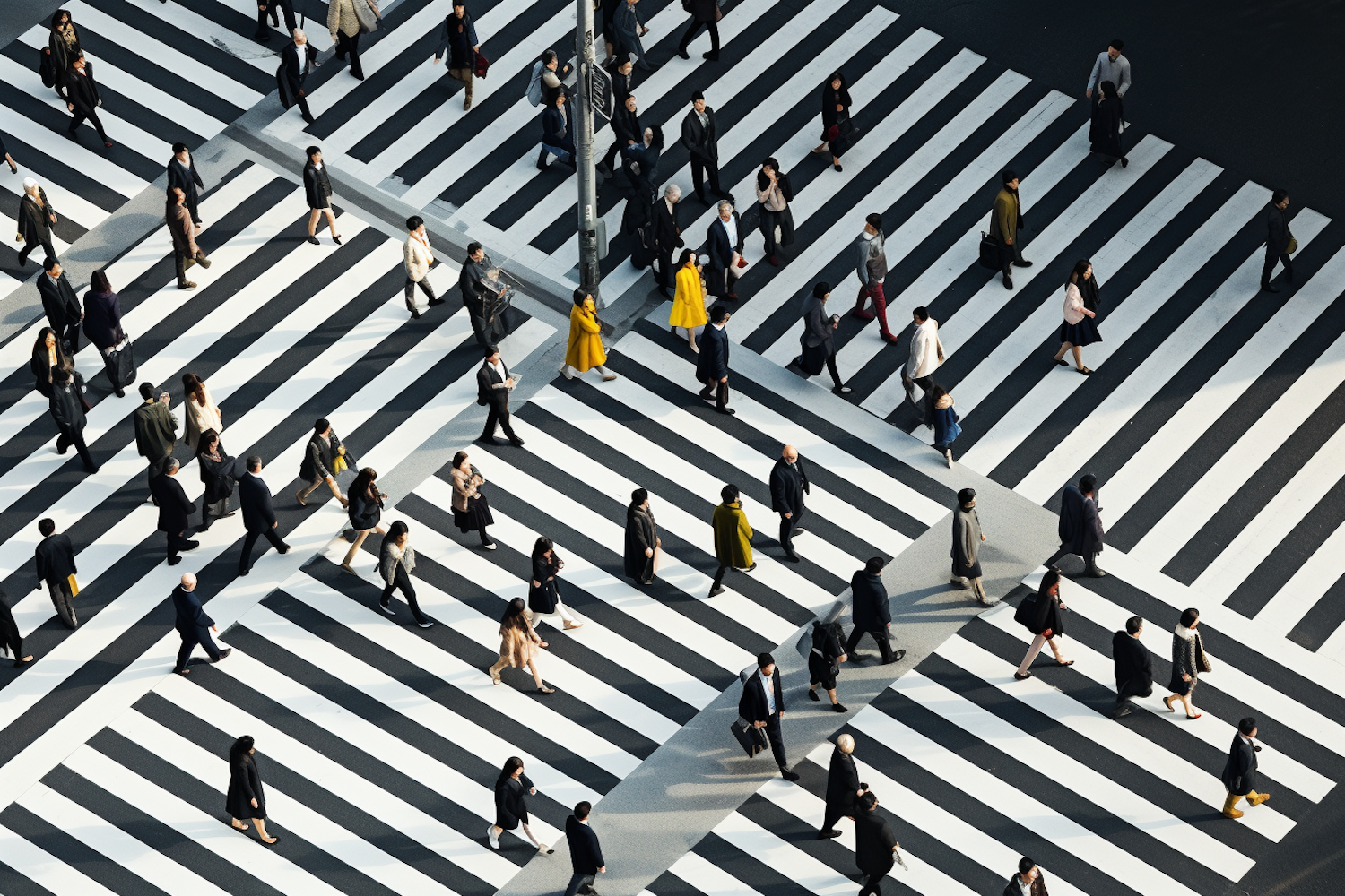 Aerial view of a busy crosswalk with diverse pedestrians, featuring bold black and white stripes and pops of yellow clothing.