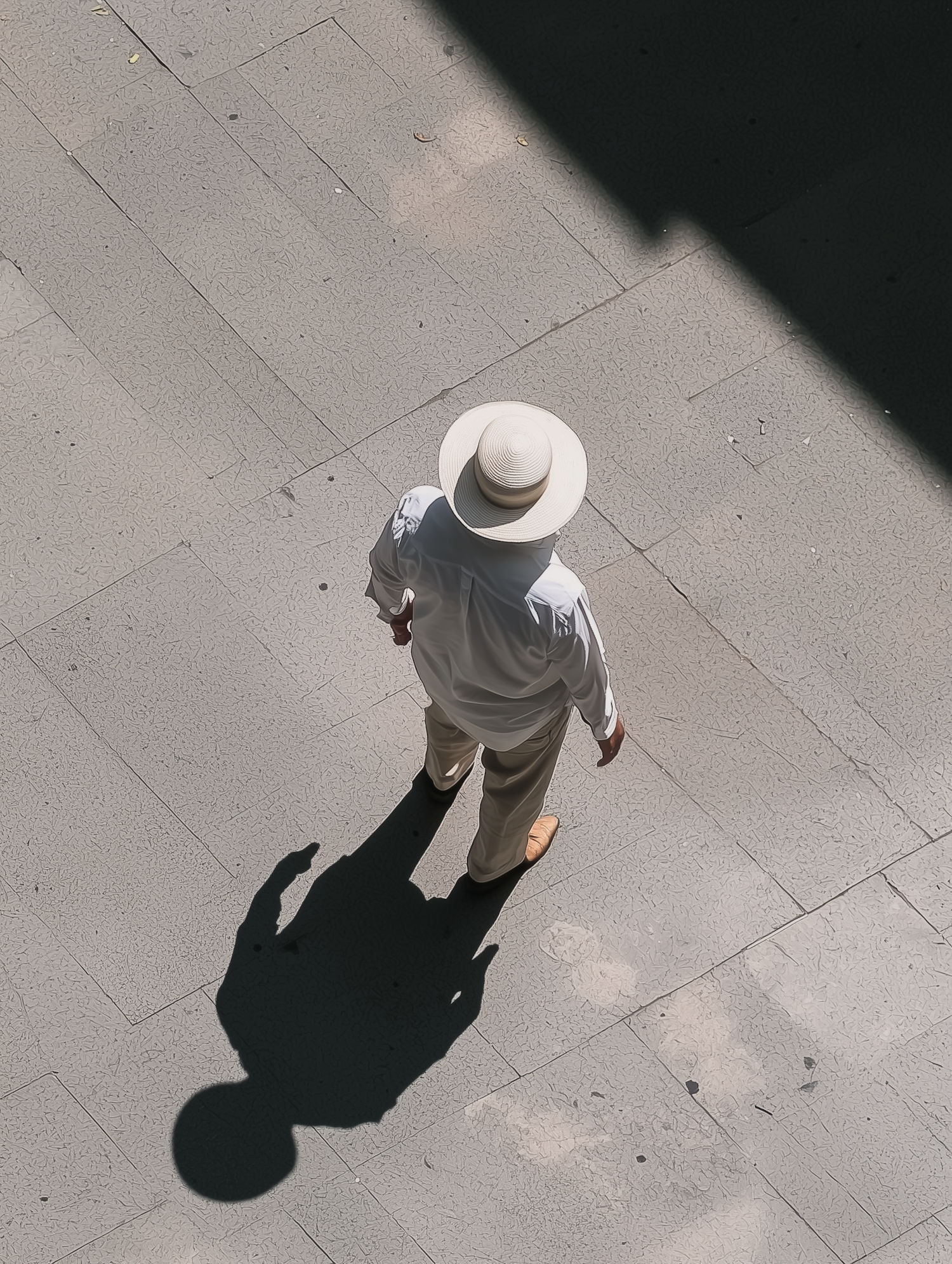 Overhead view of a person in a white shirt and hat casting a sharp shadow on a light gray tiled pavement in bright sunlight.