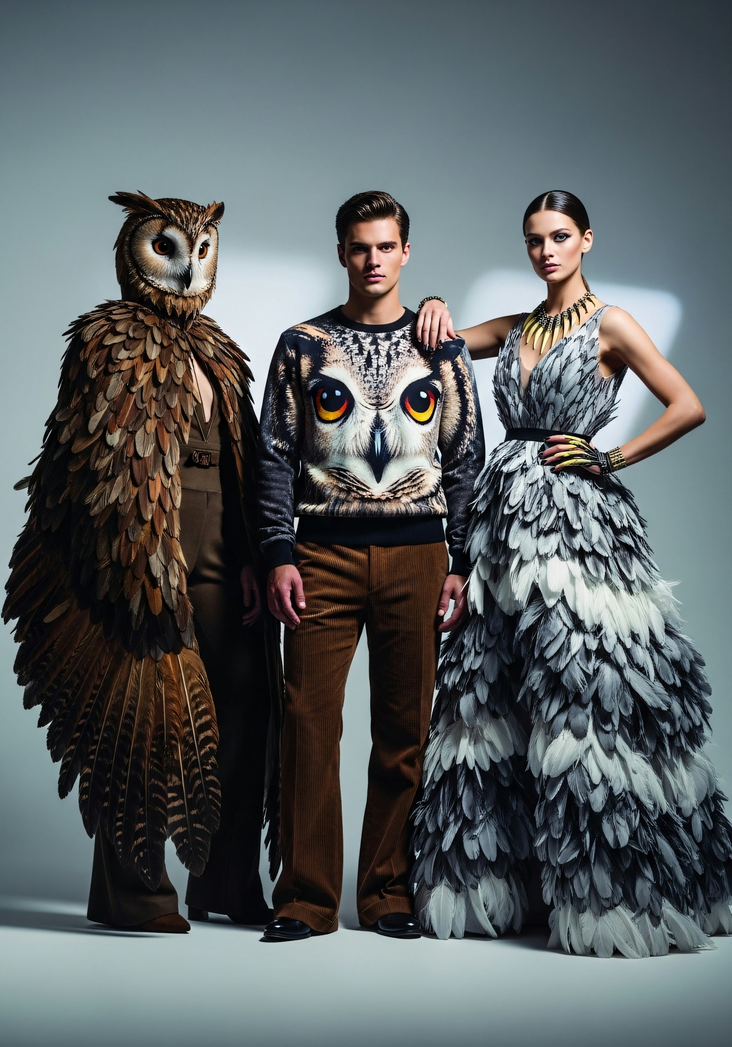 Three individuals in owl-inspired fashion, featuring a feathered costume, an owl-face sweater, and a feathered gown, in a studio setting.
