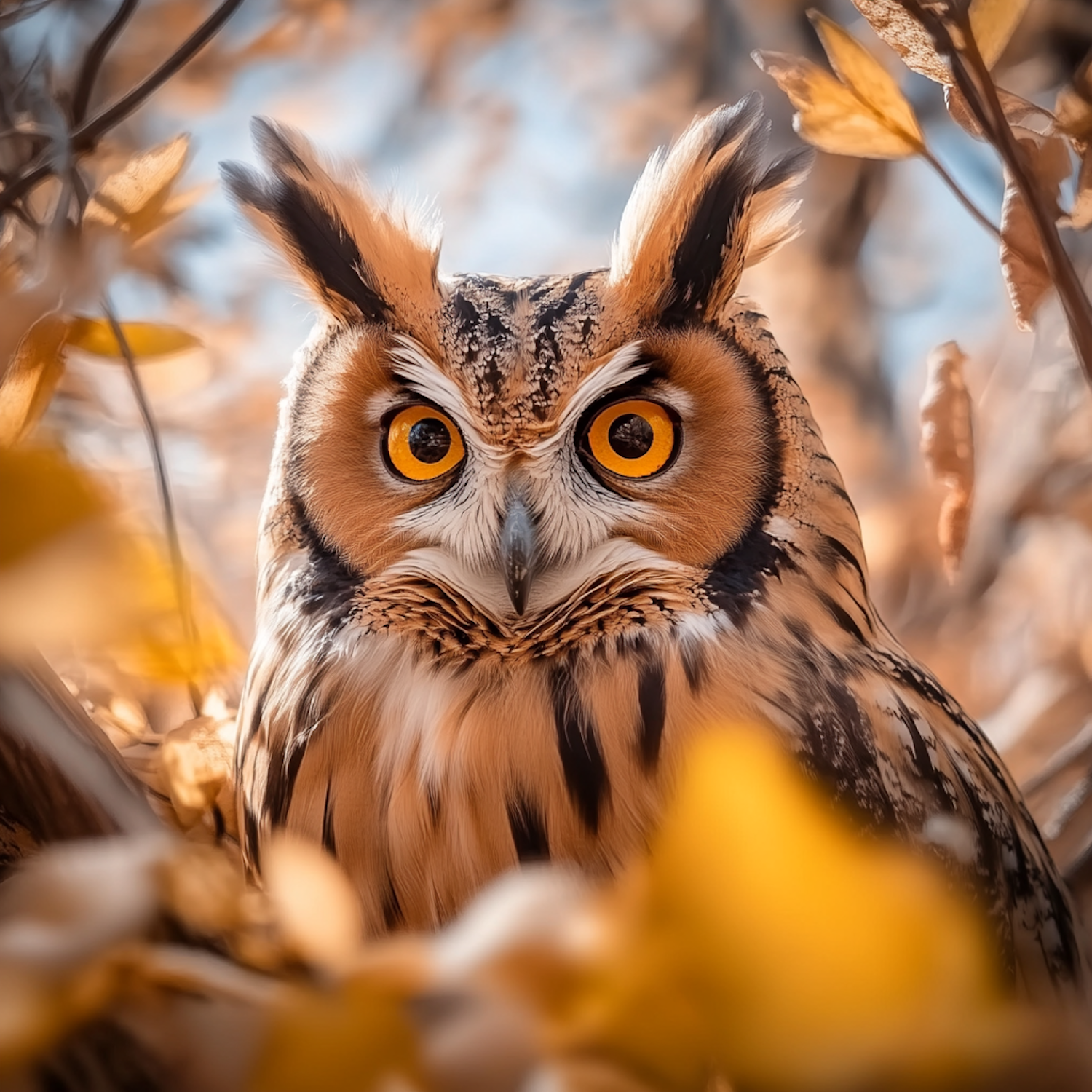 A majestic owl with vivid orange eyes amidst autumn leaves, showcasing its striking plumage and intense gaze.