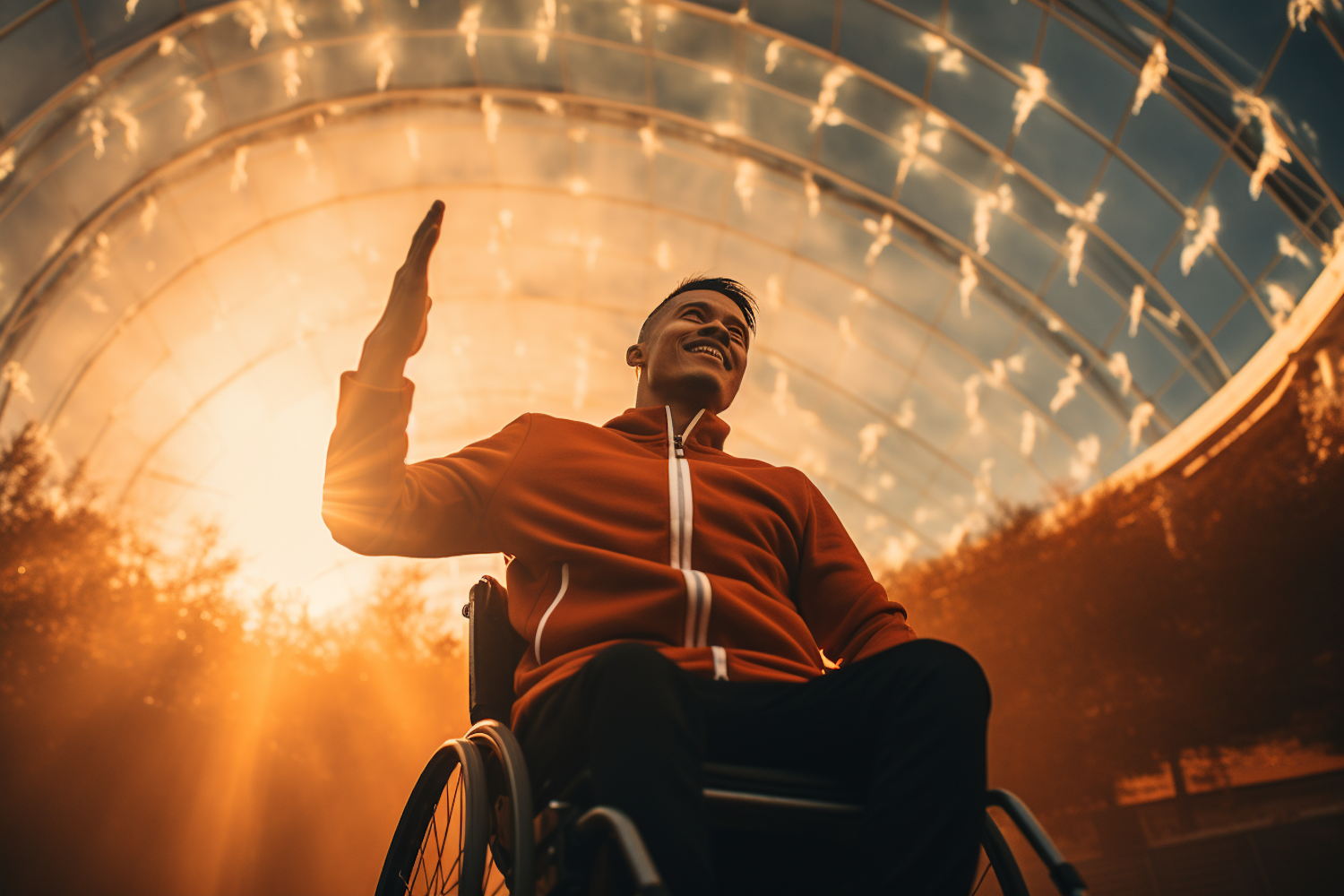 Young man in wheelchair, smiling under a sunlit arched structure, wearing an orange jacket. Uplifting and positive atmosphere.