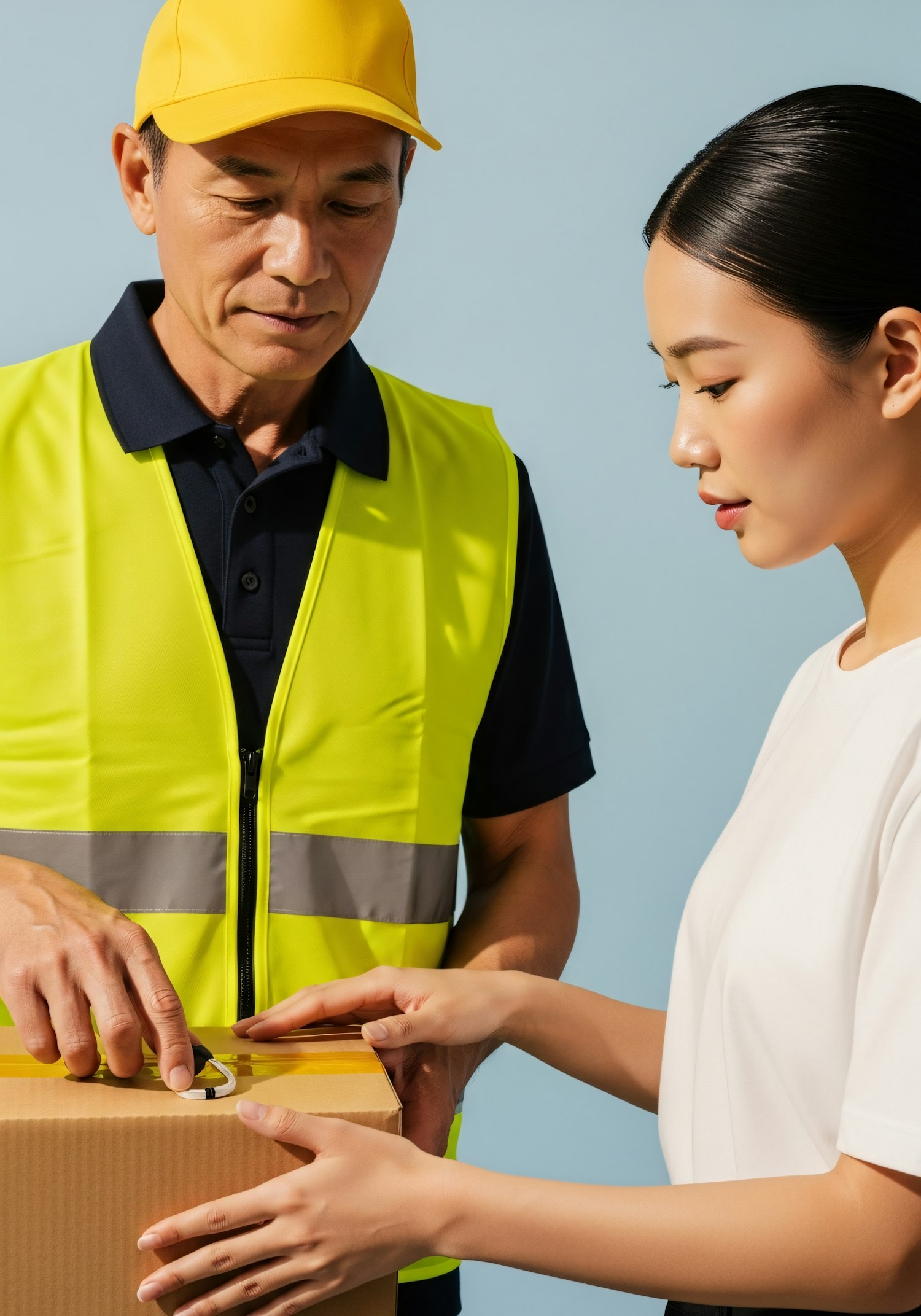 A delivery worker hands a package to a recipient against a light blue background, highlighting the interaction and the bright yellow vest.