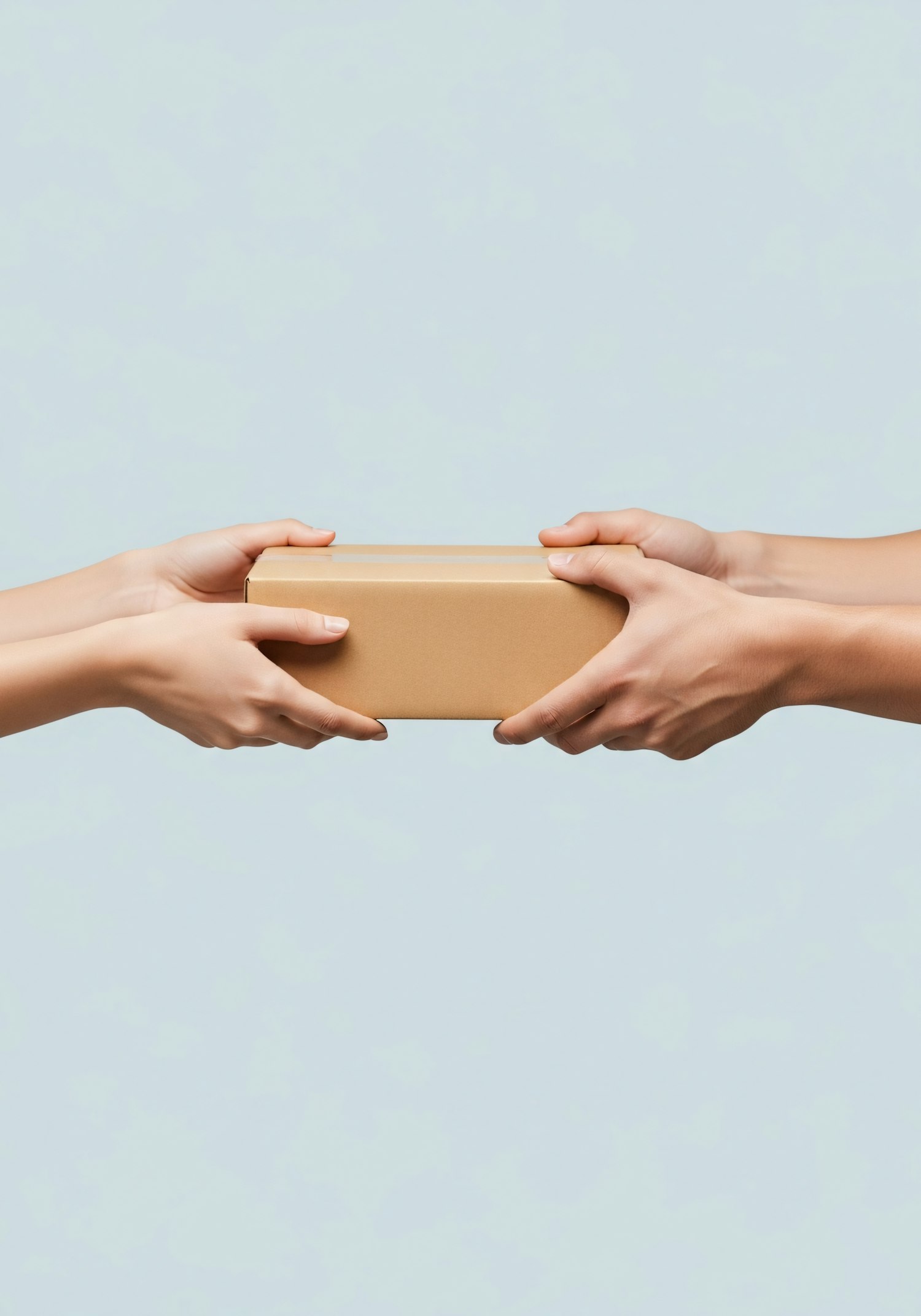 Two hands exchanging a small cardboard box against a light blue background, symbolizing delivery or gift-giving.