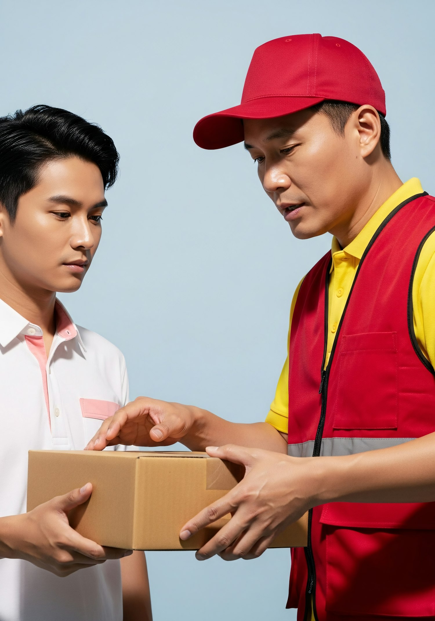 A delivery worker hands a package to a recipient in a professional exchange, set against a clean, light blue background.