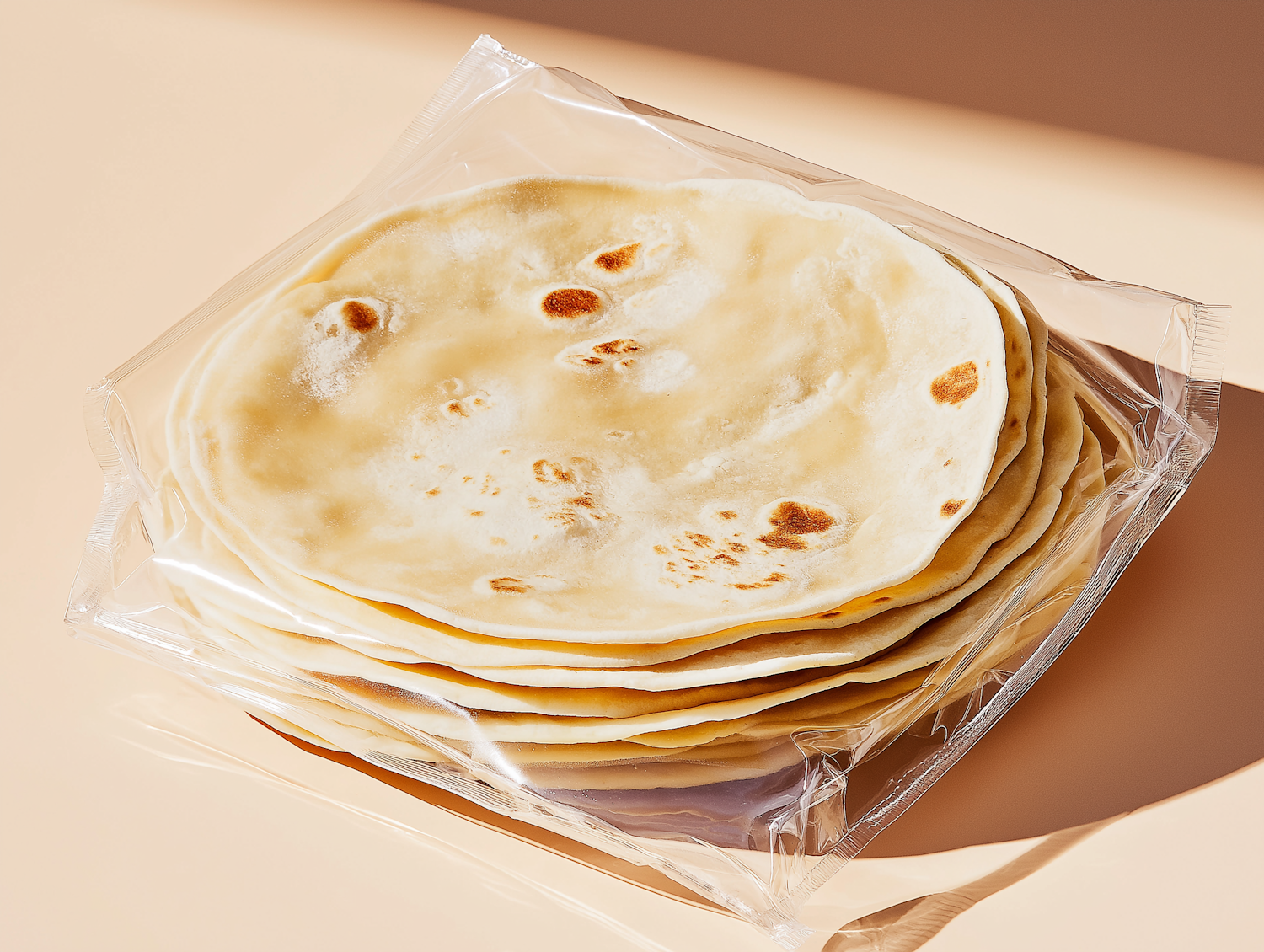 Stack of golden-brown tortillas in clear plastic wrap on a beige background, showcasing freshness and texture.