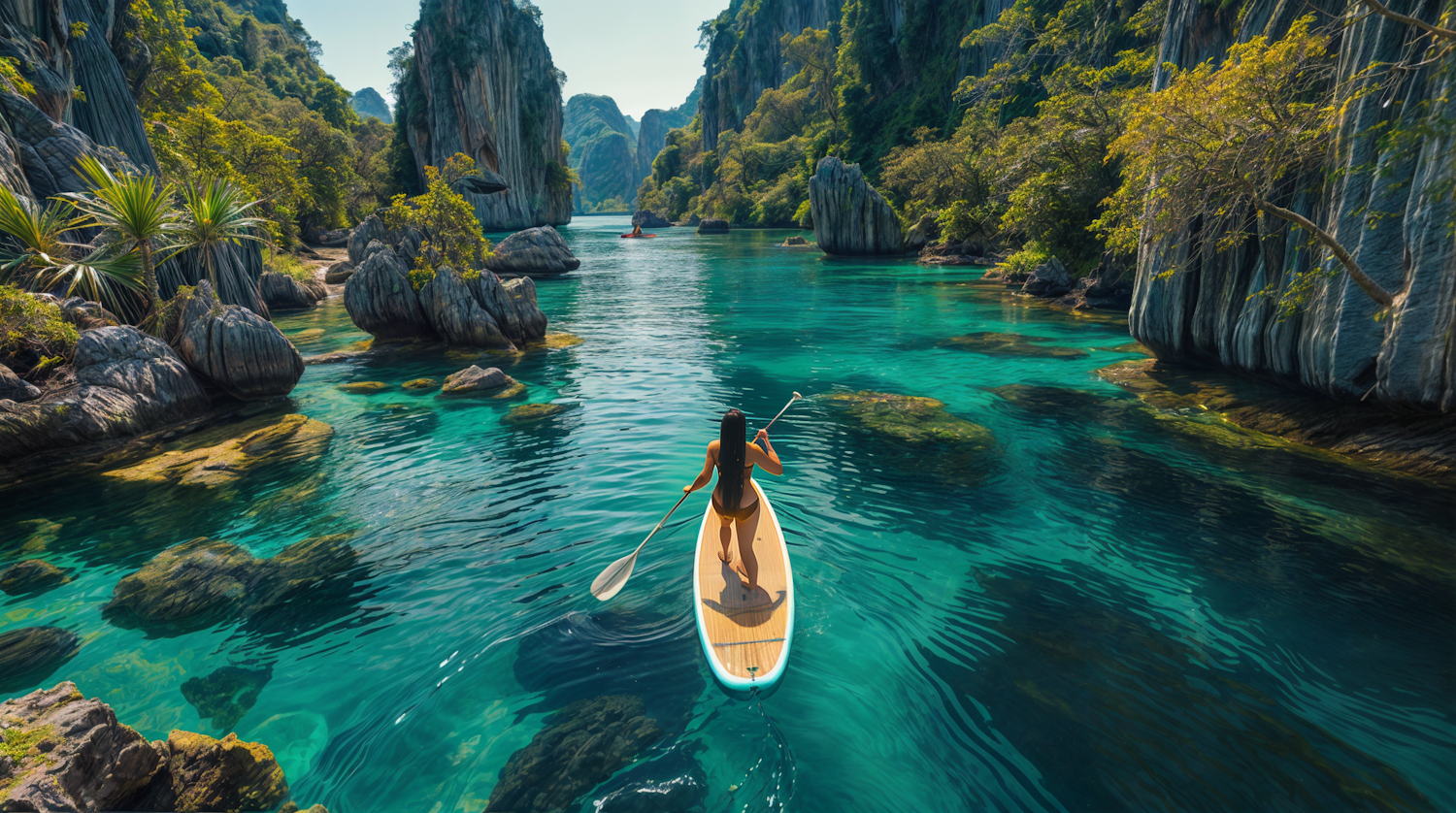 Woman paddleboarding in a turquoise lagoon surrounded by lush cliffs and clear skies, creating a serene and picturesque scene.