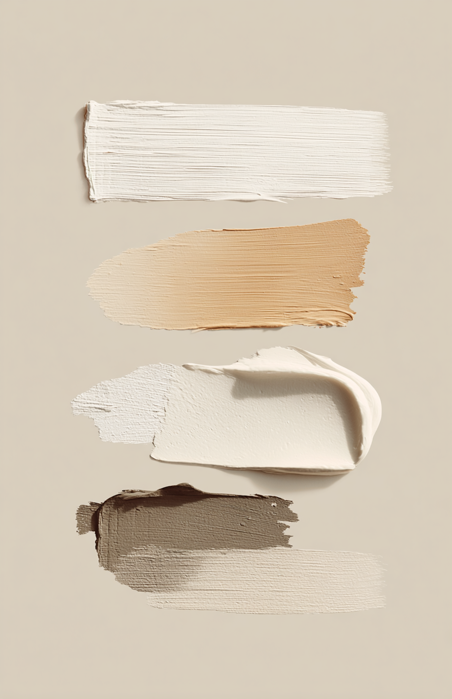Minimalist image of textured cream or paint swatches in shades of white, beige, tan, and brown on a neutral background.