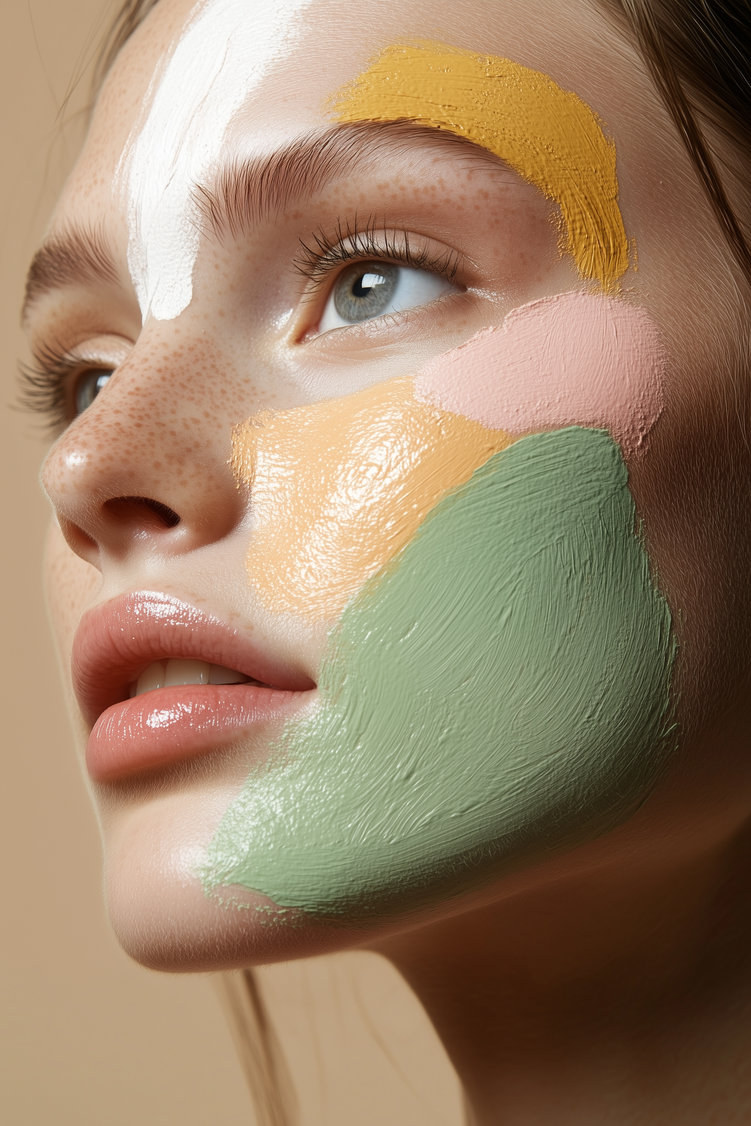 Close-up of a woman's face with colorful paint strokes, showcasing vibrant makeup art on fair skin.