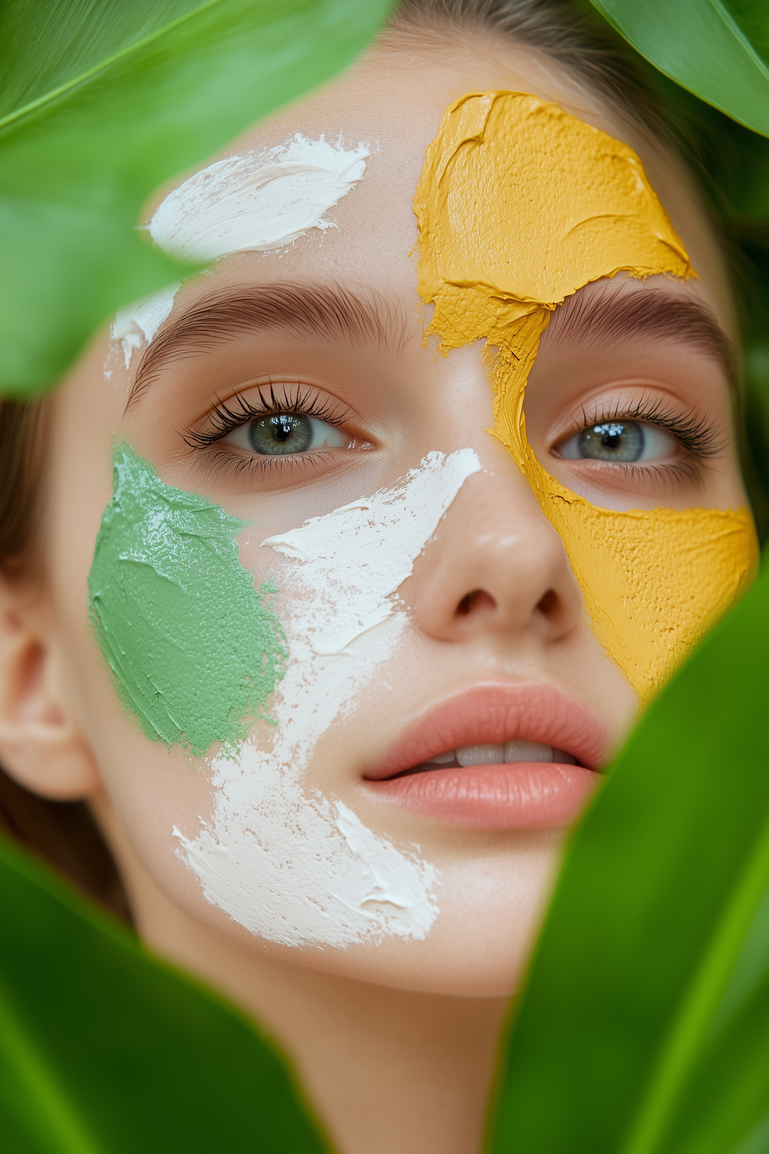 Close-up of a woman's face with colorful clay patches, surrounded by green leaves, creating a vibrant and artistic look.