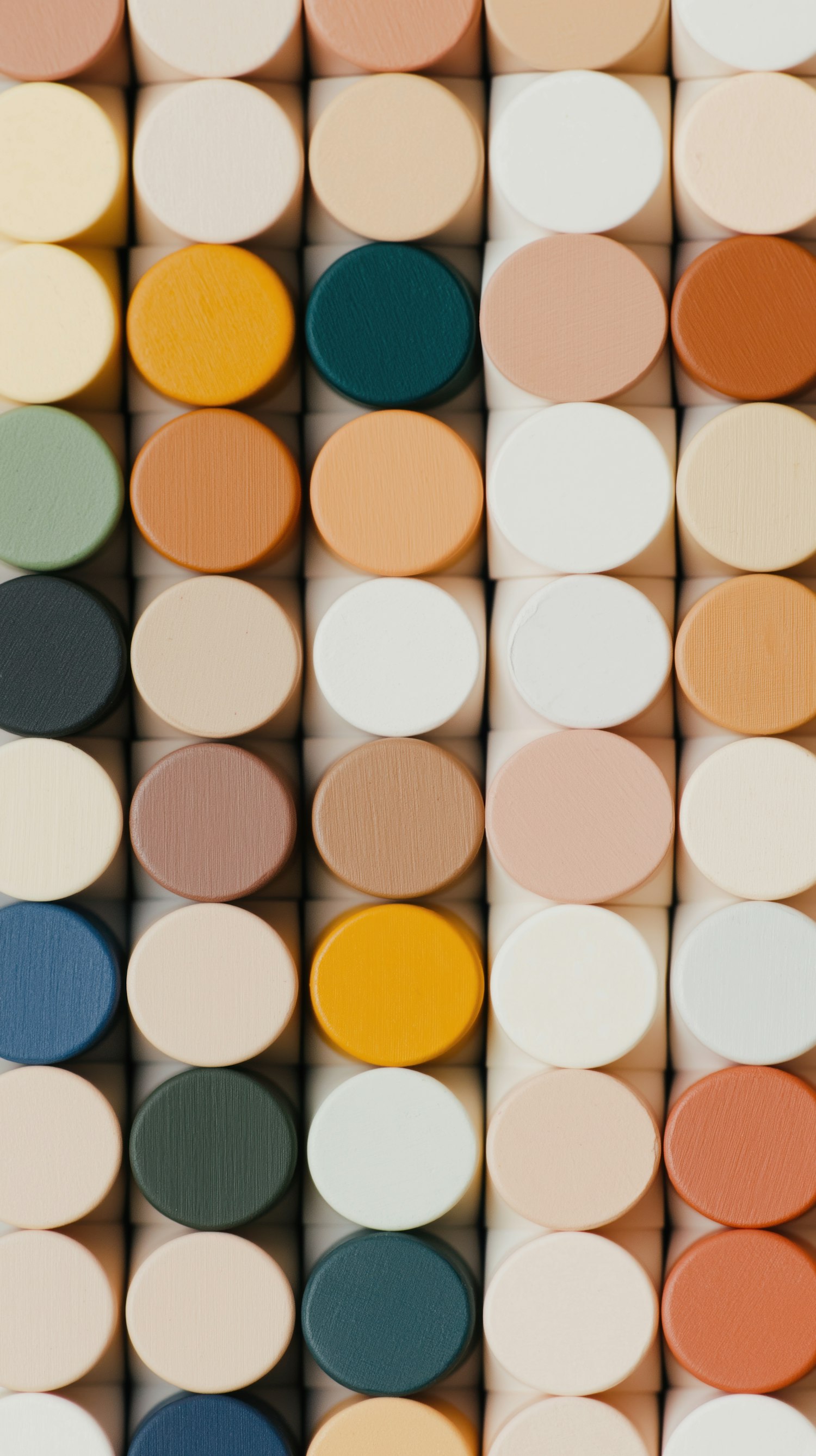 A grid of colorful circular wooden blocks in earthy tones like beige, green, and mustard yellow, creating a modern and minimalistic pattern.
