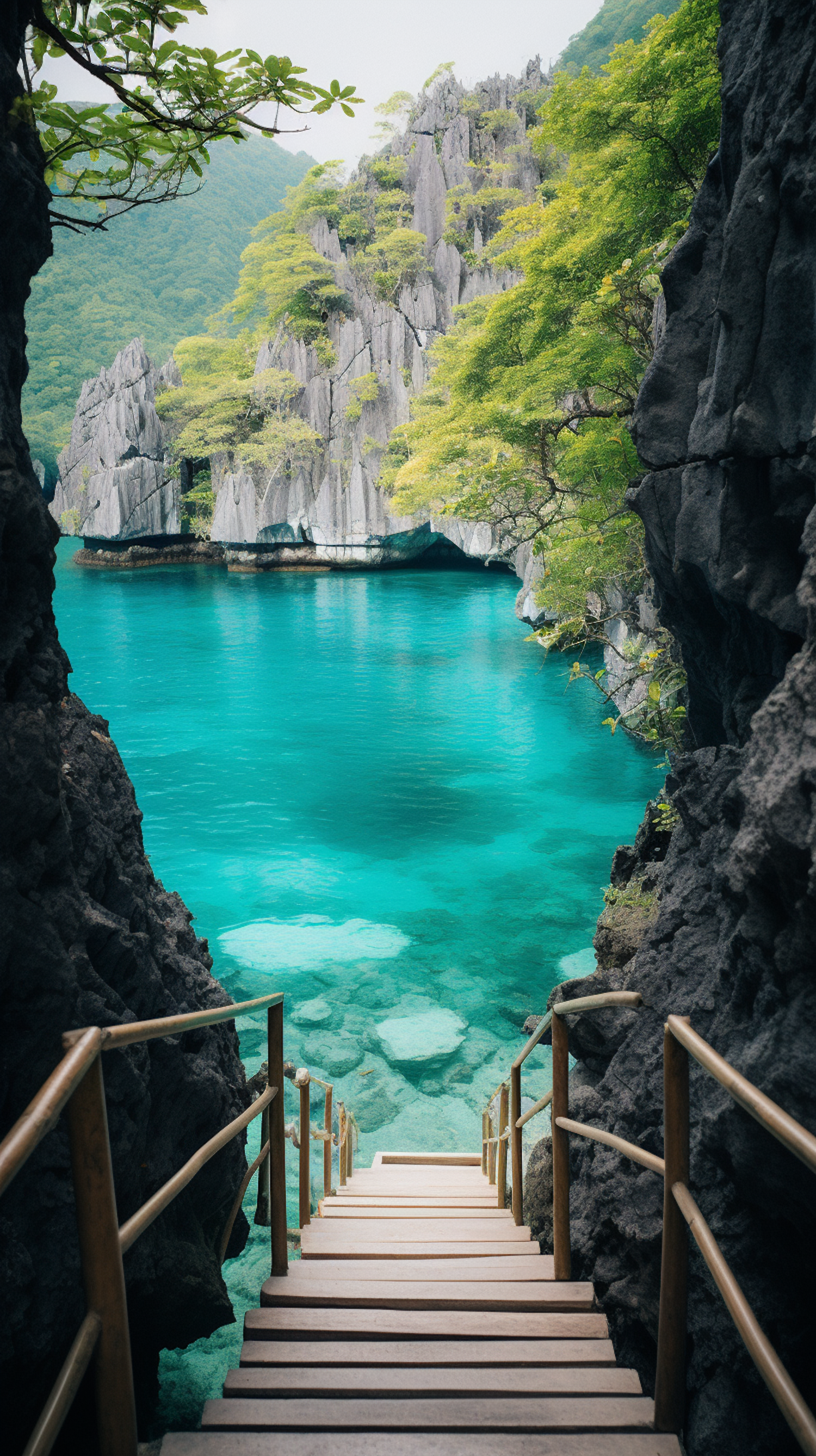 Wooden stairs lead to a turquoise lagoon surrounded by lush cliffs and limestone formations, creating a serene tropical paradise.