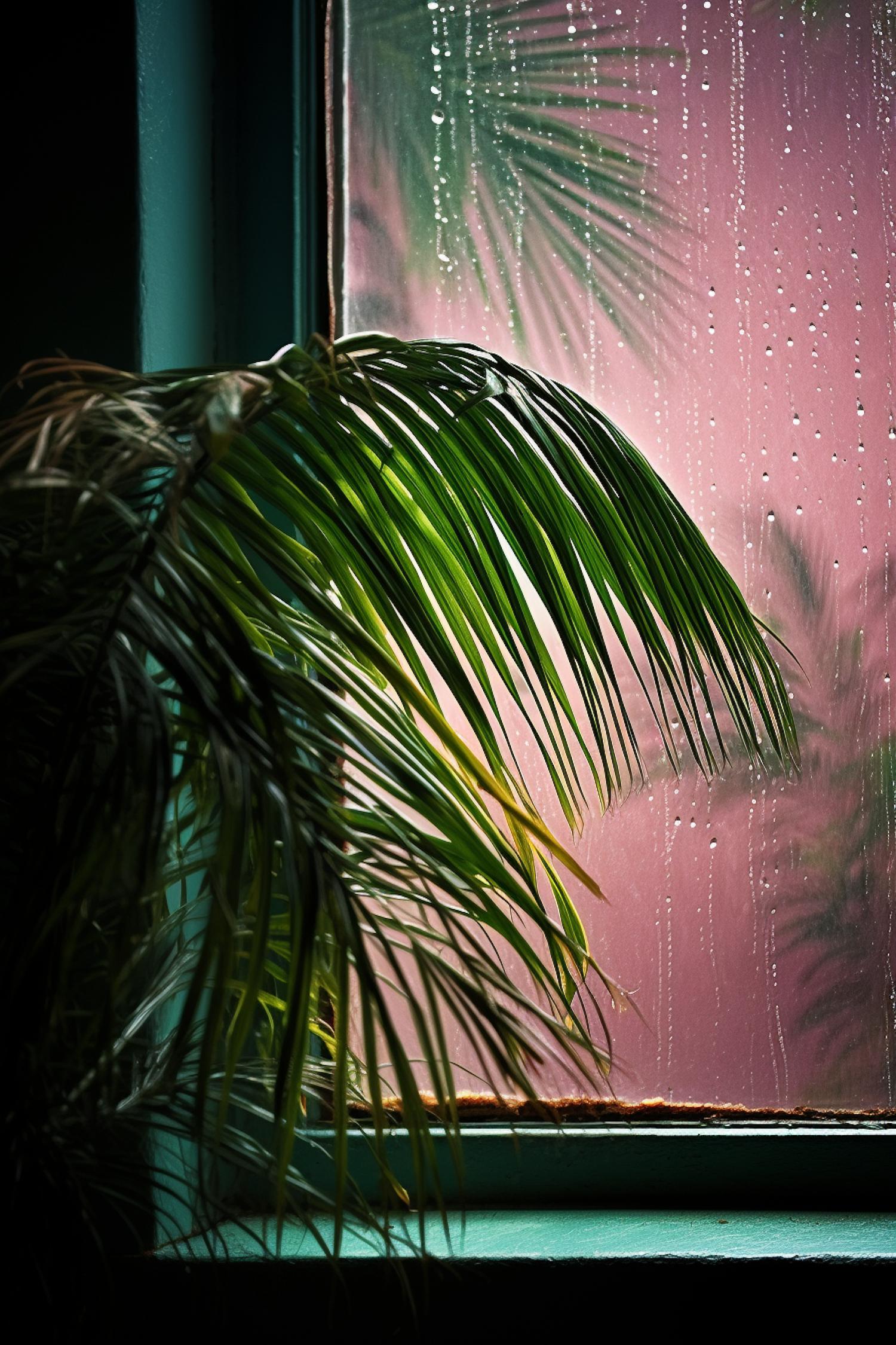 Vibrant green palm leaf against a pink backdrop with raindrops on a teal-framed window, creating a serene and calming scene.