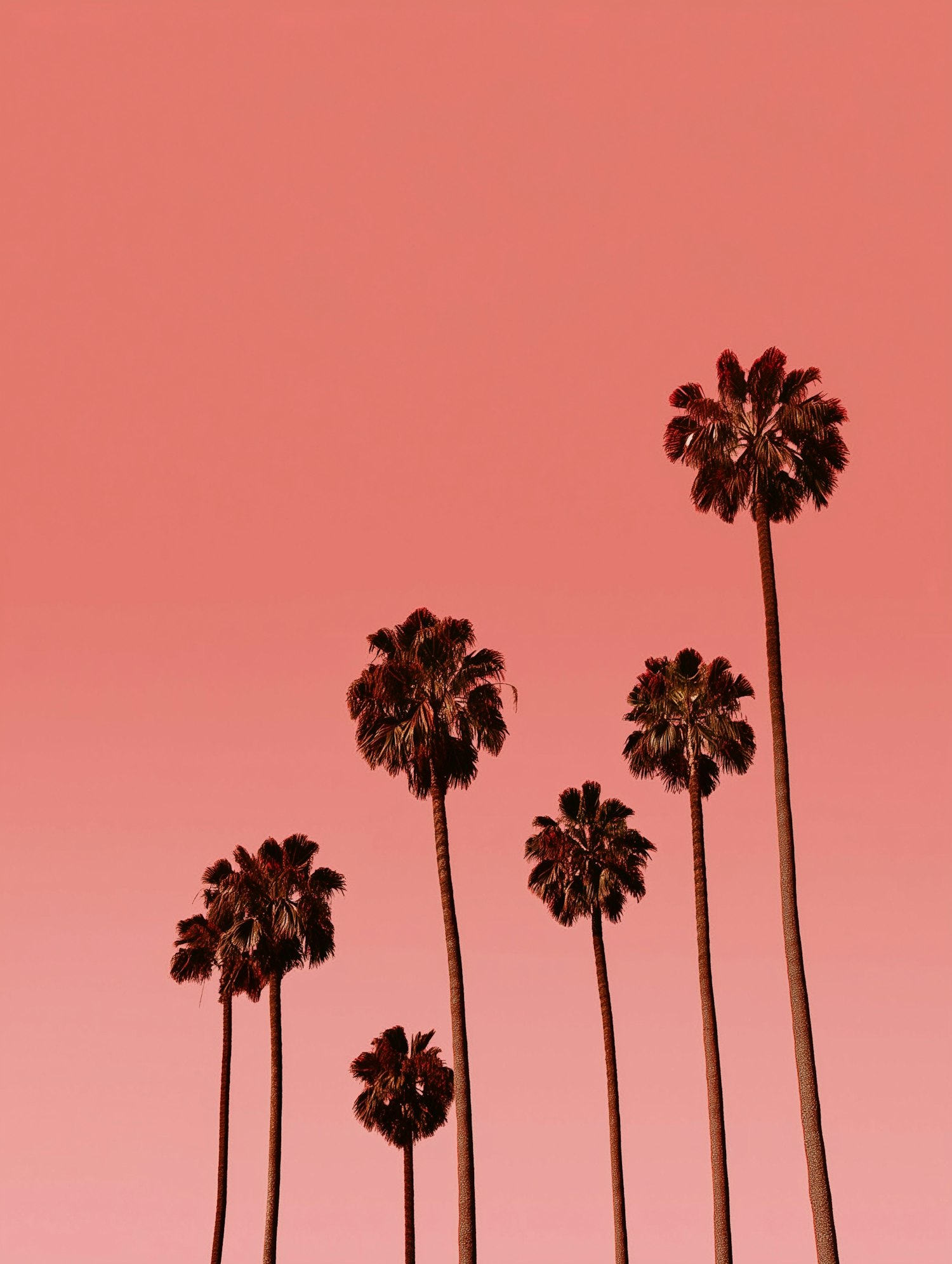 Tall palm trees silhouetted against a vibrant pink gradient sky, creating a striking and minimalistic tropical scene.