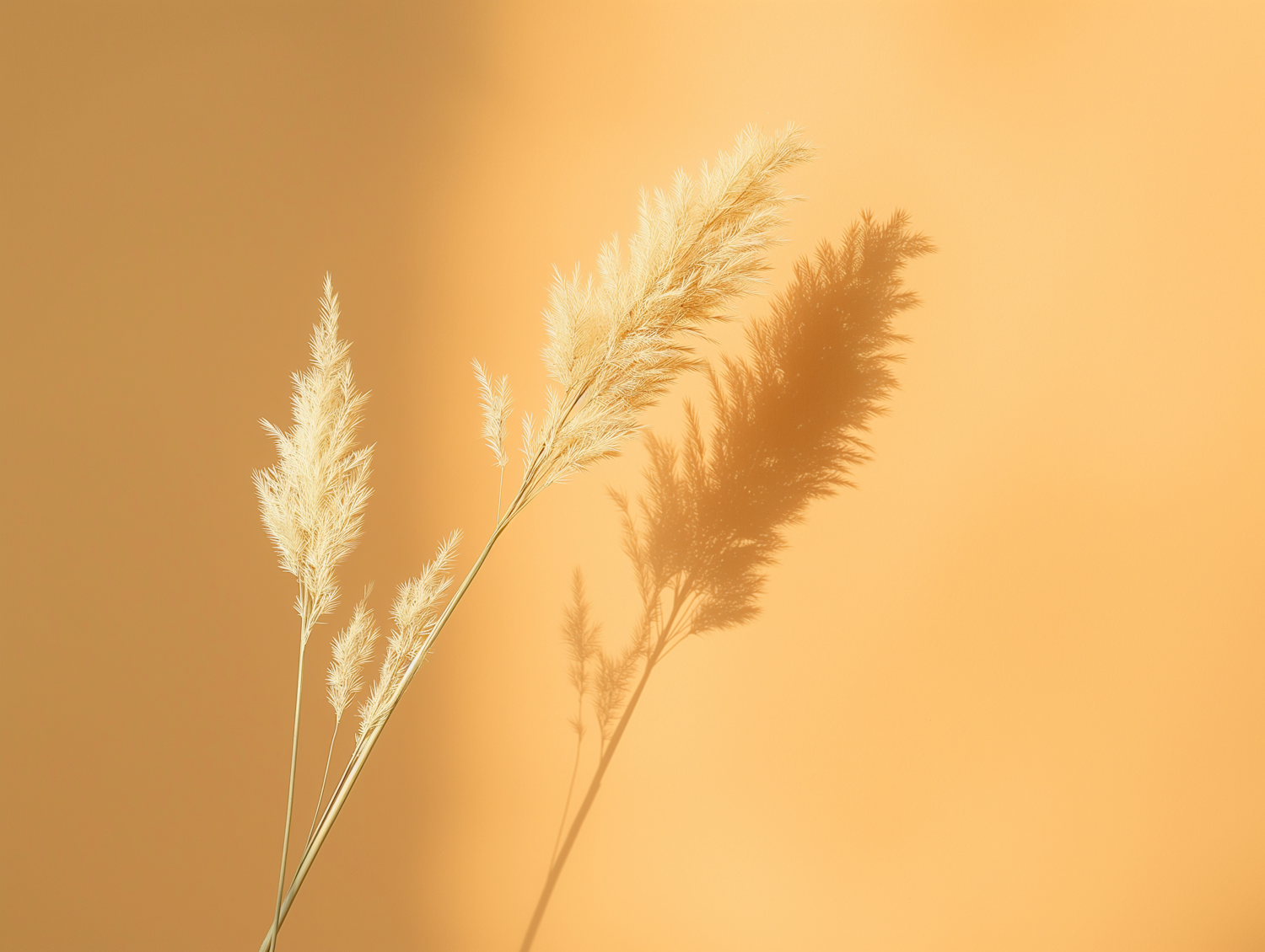 Elegant pampas grass against a warm golden background, casting soft shadows. Minimalist and calming natural composition.
