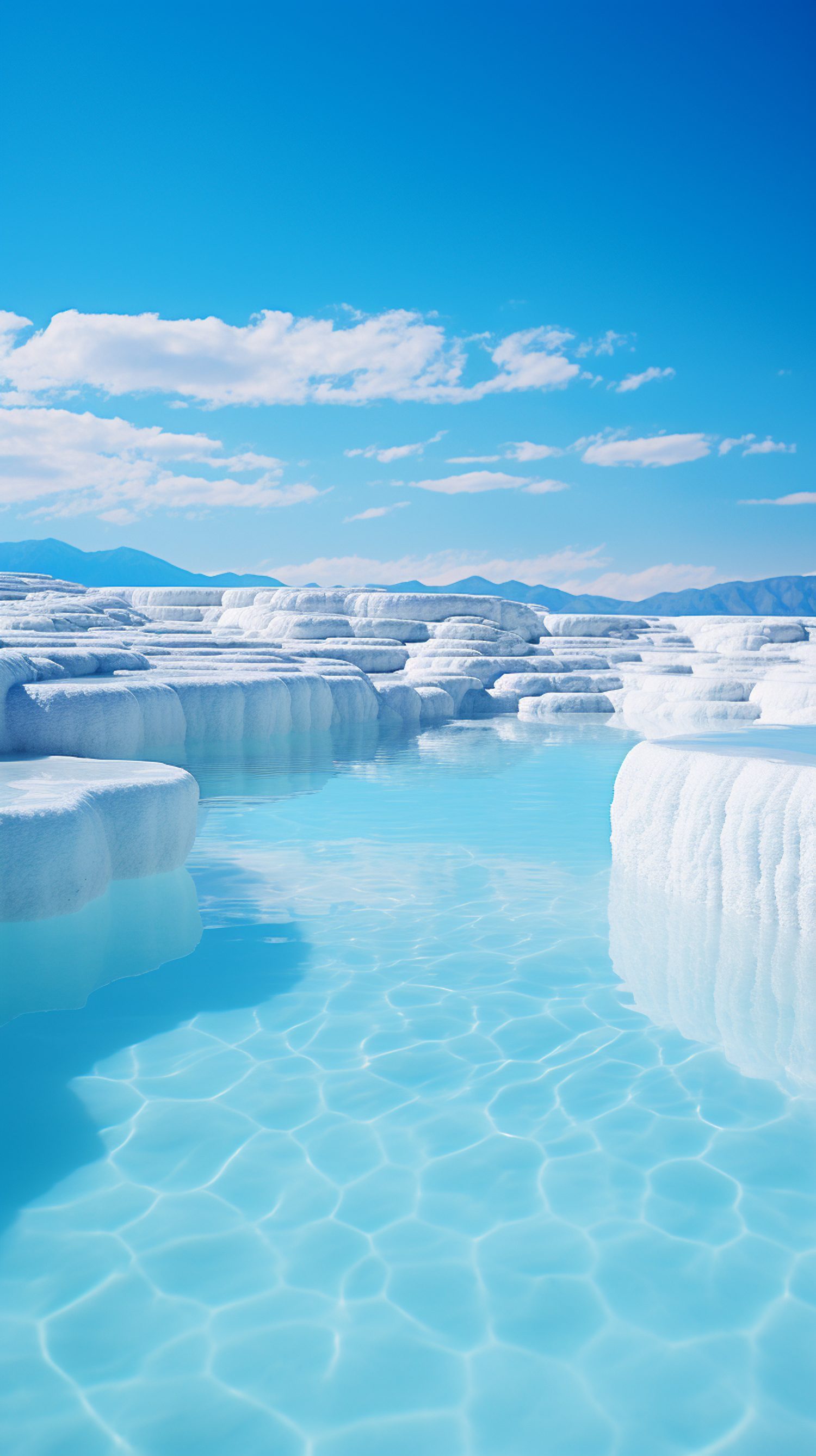Breathtaking travertine terraces with turquoise water under a clear blue sky, surrounded by distant mountains and fluffy clouds.