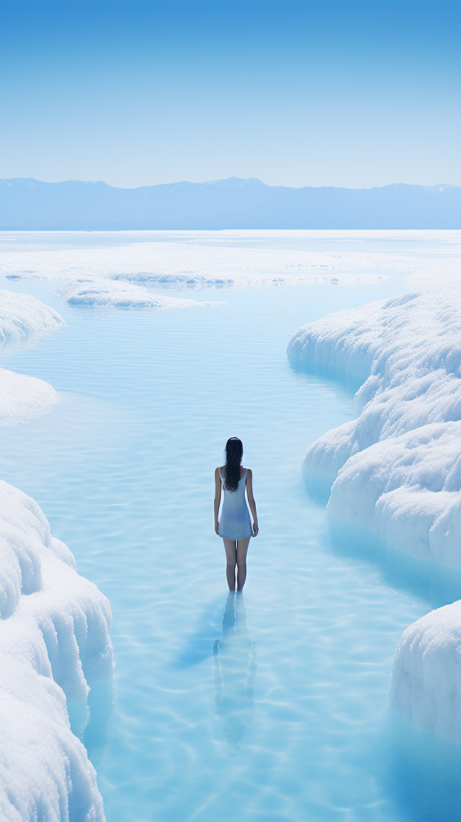 Woman in white dress stands in icy blue water, surrounded by snowy banks under a clear sky.